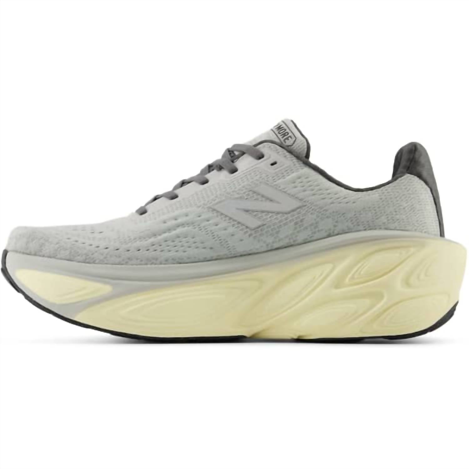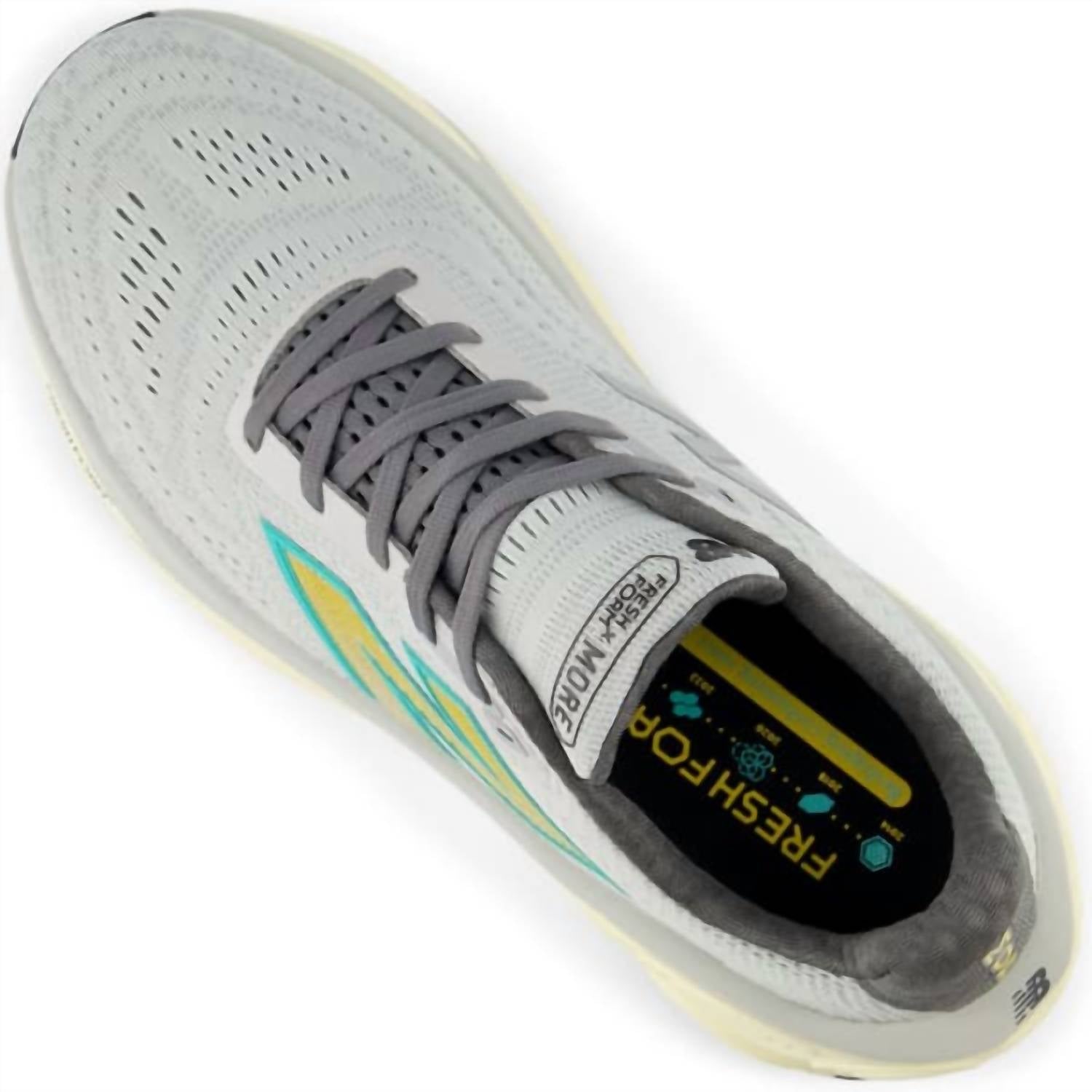 Experience unparalleled comfort with the Men's Fresh Foam X More V5 Sneakers by New Balance, designed to enhance your running sessions. These Brighton Grey, Calcium, and Cyber Jade athletic shoes feature a mesh upper for breathable support and a round toe shape for unrestricted movement. Its Fresh Foam X midsole provides maximum cushioning, incorporating approximately 3% bio-based materials, while the data-driven outsole ensures stability and a natural stride. Perfect for summer athleisure trends and suitable for fitness or workout occasions.