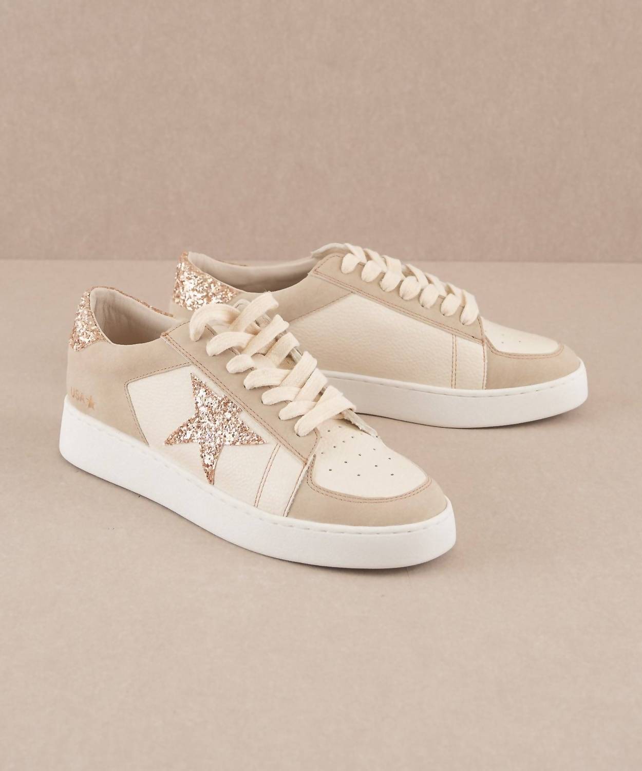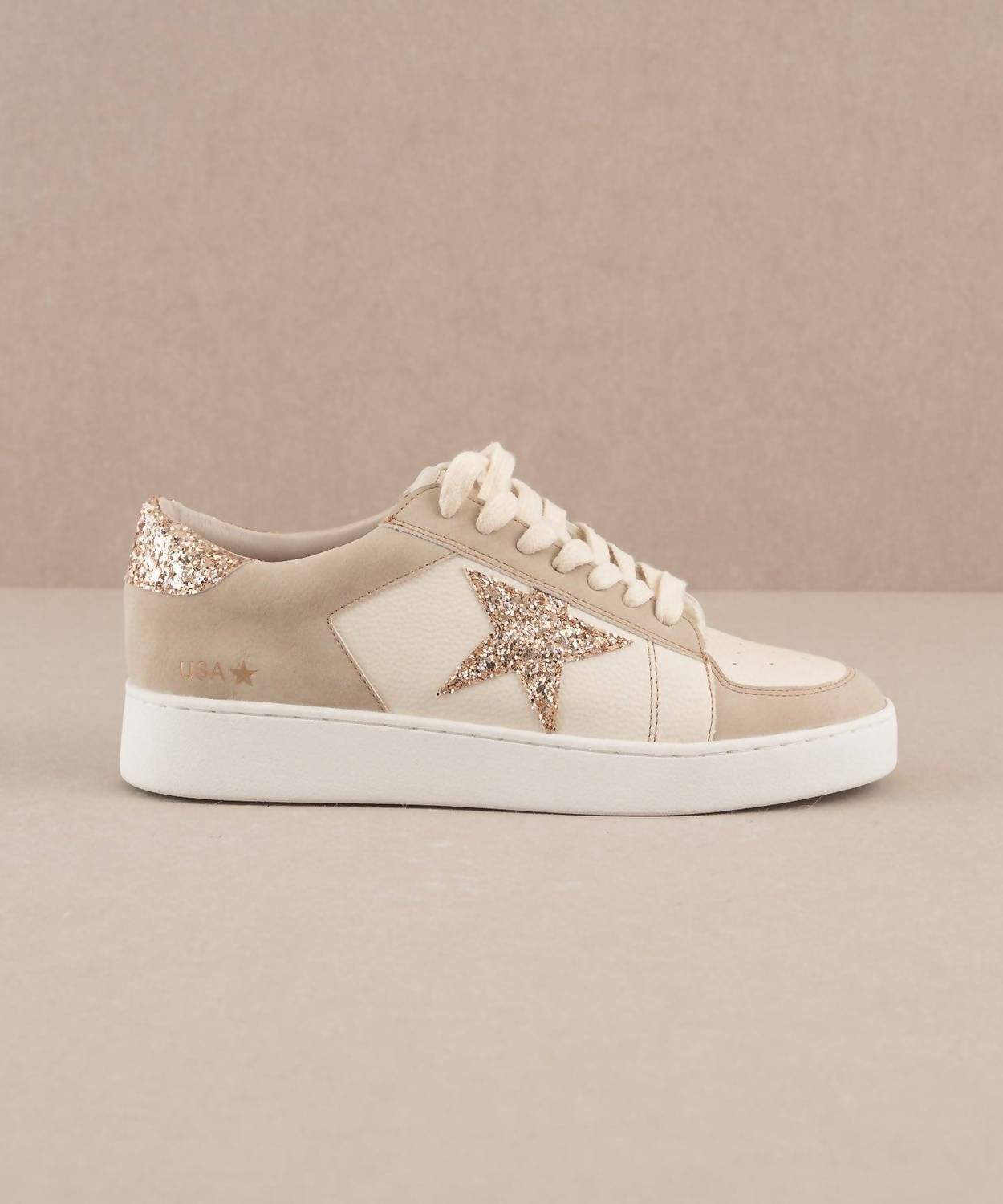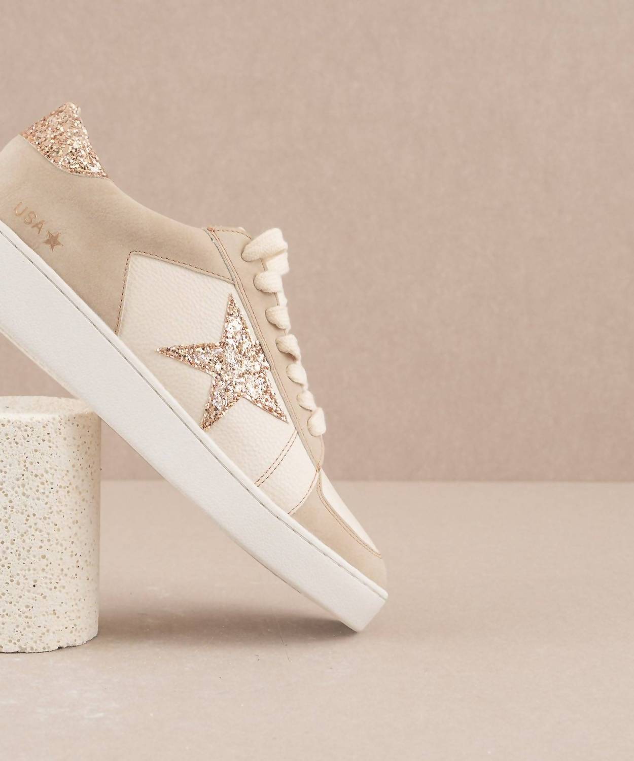 Elevate your casual style with the Women's Liberty Glitter Star Sneaker by OASIS SOCIETY, designed for both flair and comfort. These low-top sneakers feature a premium vegan leather upper and soft latex insole for all-day support. With a lace-up closure, rubber outsole, and 3" shaft height, every step is secure and stylish. Heel height is 1.25", and the 11.5" shoe opening circumference ensures easy wearability.