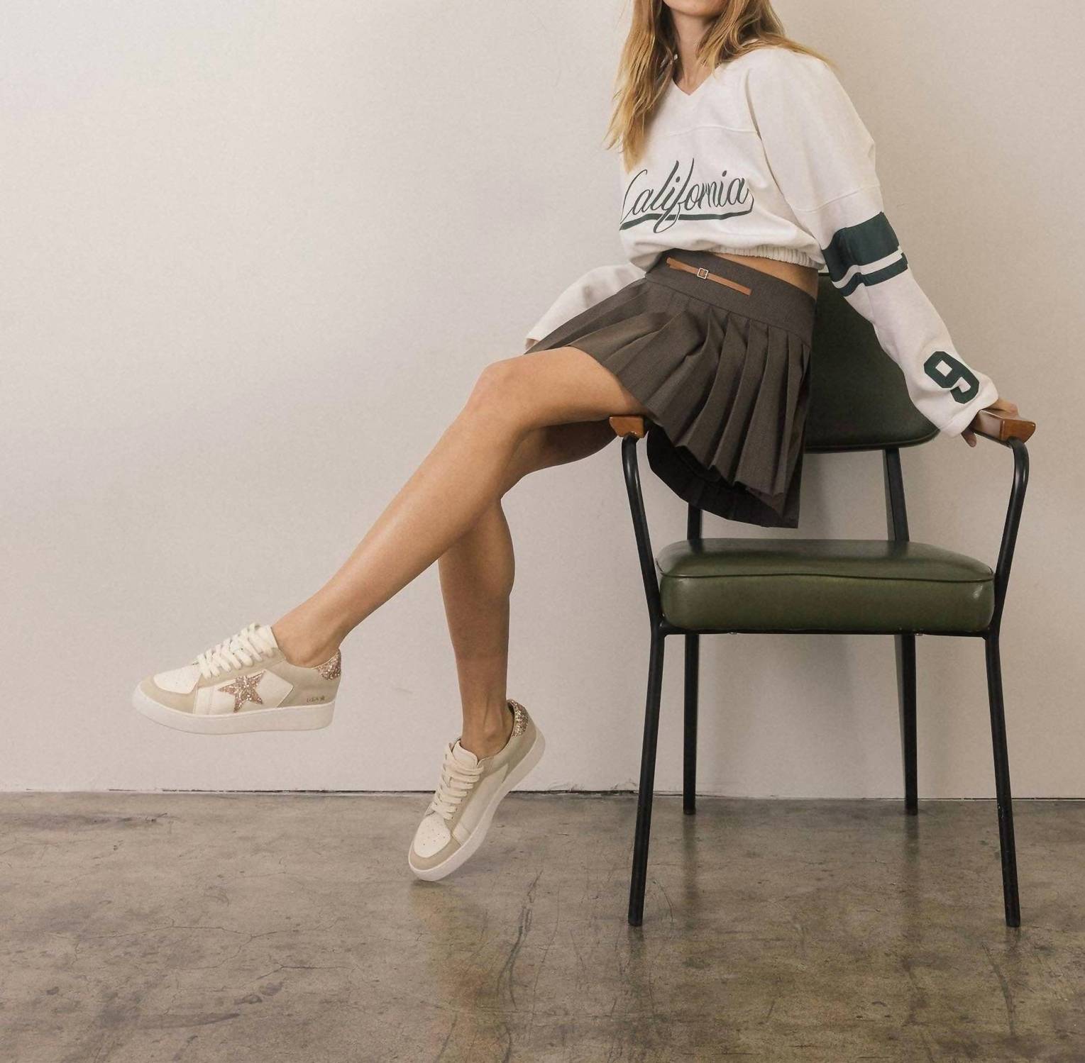 Get your daily steps in with these adorable sneakers. Elevate your casual style with the Women's Liberty Glitter Star Sneaker by OASIS SOCIETY, designed for both flair and comfort. These low-top sneakers feature a premium vegan leather upper and soft latex insole for all-day support. With a lace-up closure, rubber outsole, and 3" shaft height, every step is secure and stylish. Heel height is 1.25", and the 11.5" shoe opening circumference ensures easy wearability.