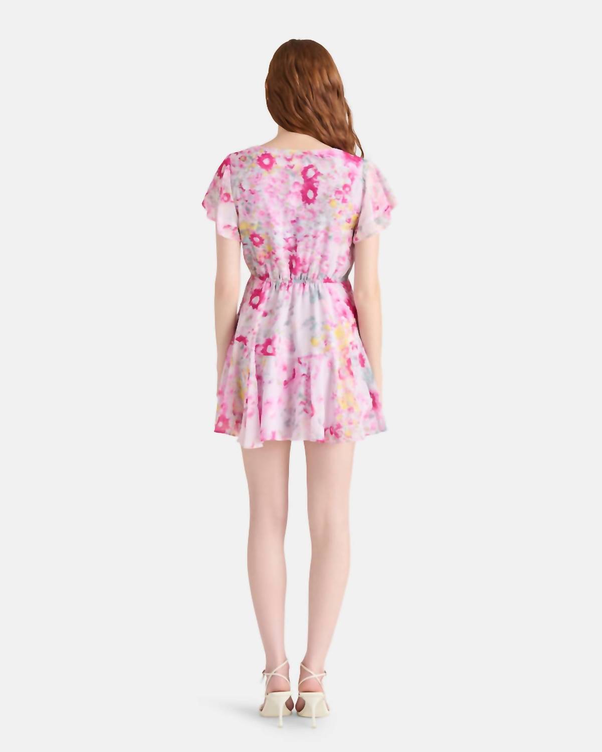 The perfect mini dress for those warmer months. The Kirsty Dress by Steve Madden is crafted from lightweight 100% polyester chiffon, designed for an effortlessly chic Spring look in vibrant floral print. With short sleeves and a cinched elasticized waist, it forms a flattering A-line silhouette, complete with a V-neckline and self-tie detail. This mini dress, made for a boho chic vacation style, is imported and features a convenient pull-on closure. Care for it easily with machine wash cold instructions.