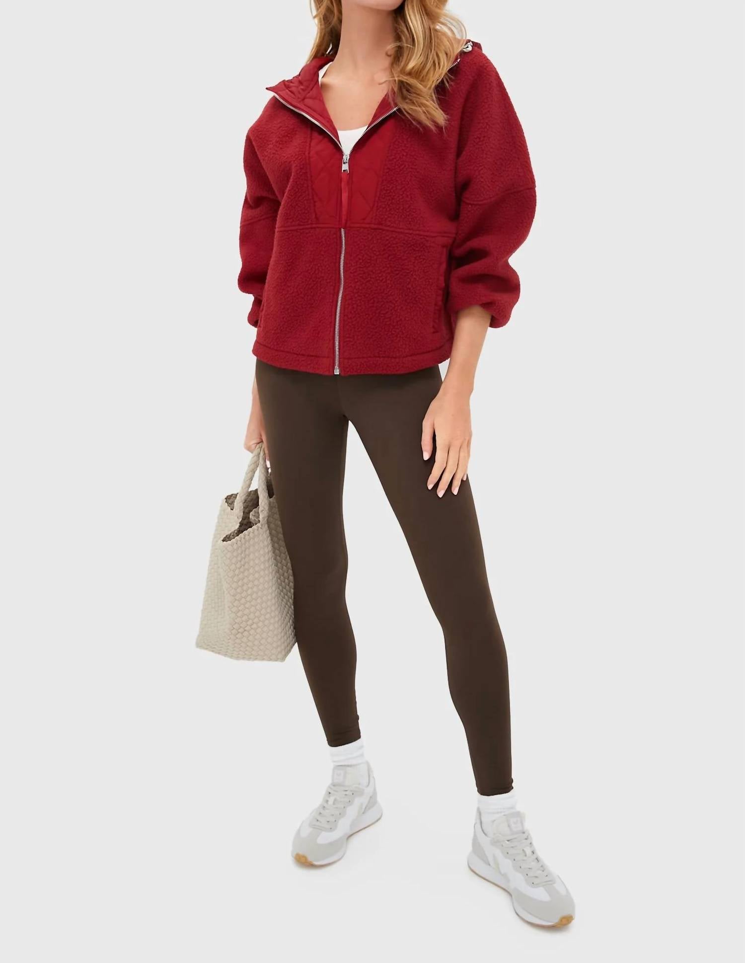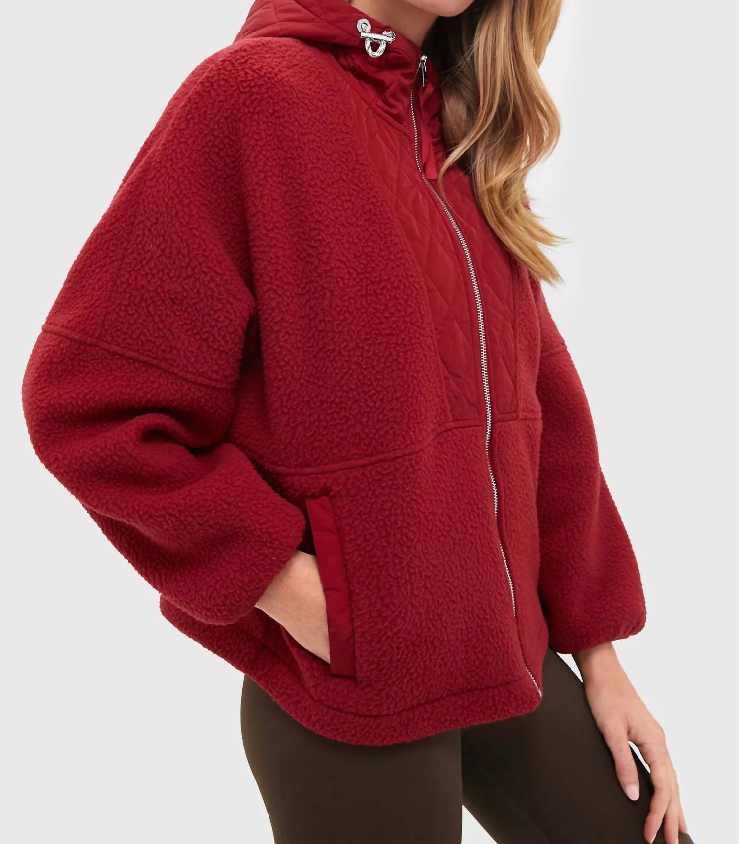 A casual yet cool jacket that every closset needs. Wrap yourself in cozy warmth with the VARLEY Richfield Quilt Fleece Combo Jacket in Red Dahlia, a chic casual essential for the season. This women's jacket features long sleeves, a quilted hood, front panel, and neckline crafted from plush fleece for ultimate comfort. Made from 100% recycled polyester with nylon panels and polyester fill, it includes a drawstring hood, side pockets, and a convenient front zip closure. For easy care, machine wash cold and lay flat to dry.