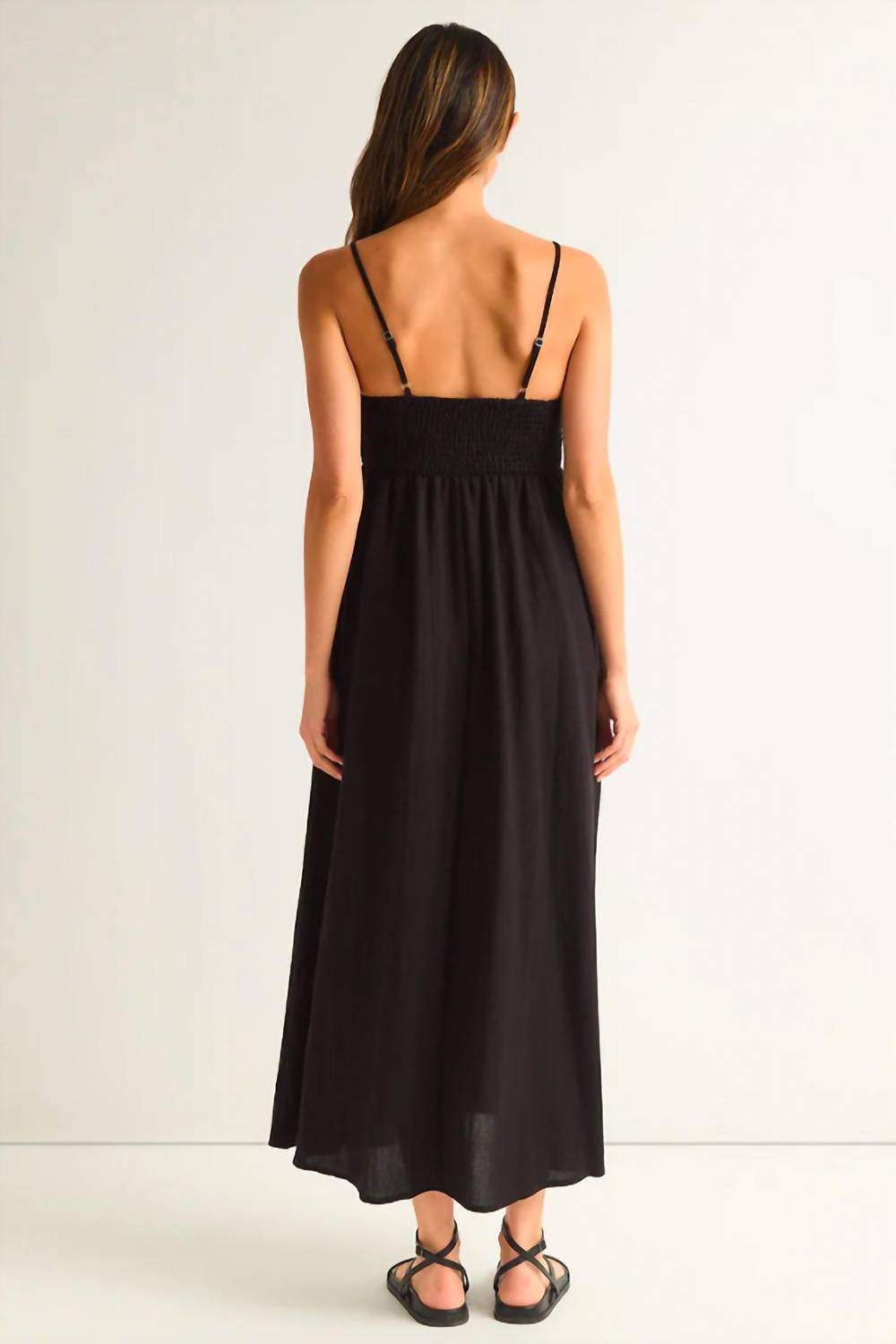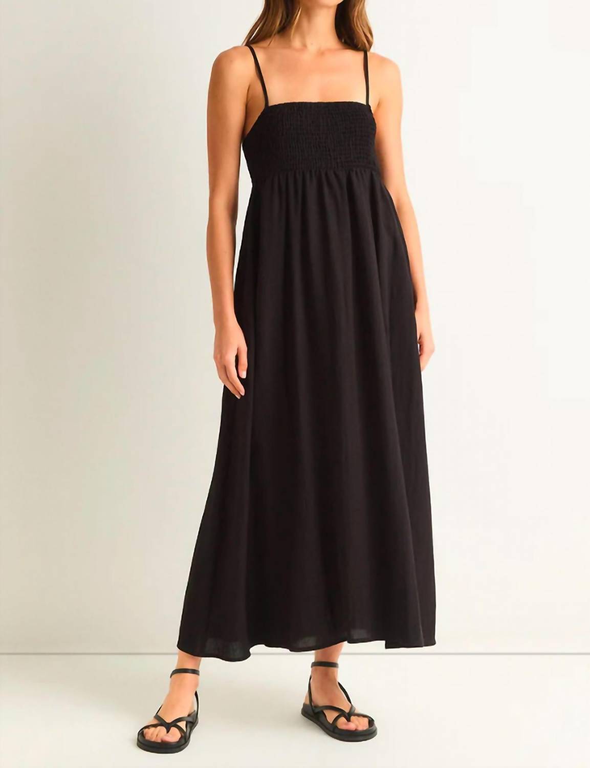 A midi dress so versatile, your options for wearing it are endless. Designed to merge comfort and sophistication effortlessly. Crafted from an airy textured blend of 90% Rayon and 10% Nylon. Perfect square neck and sleeveless design highlight your neckline and shoulders. Adjustable spaghetti straps ensure a perfect fit. Lightweight fabric is enhanced with a heavy soft wash. Providing a luxuriously soft feel. Regular fit, empire waist silhouette, and midi length. Flattering shape that flows gracefully as you move. Fully lined and versatile. Cool and stylish.