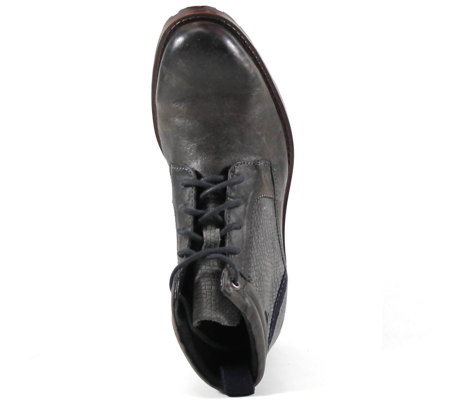 Elevate his footwear with the Men's Flip Under Lace-up Leather Boots by DIBA True, showcasing a rich grey/navy hue and a solid leather/suede mixed media upper. These boots are designed with a lace-up closure, cushioned insole, and sturdy lug sole, perfect for travel or vintage fall looks. The boots feature a round toe, block heel measuring 1" high, with a shaft height of 4.5" and a circumference of 13". Available in sizes 8-13, these boots offer versatile style for the modern man.