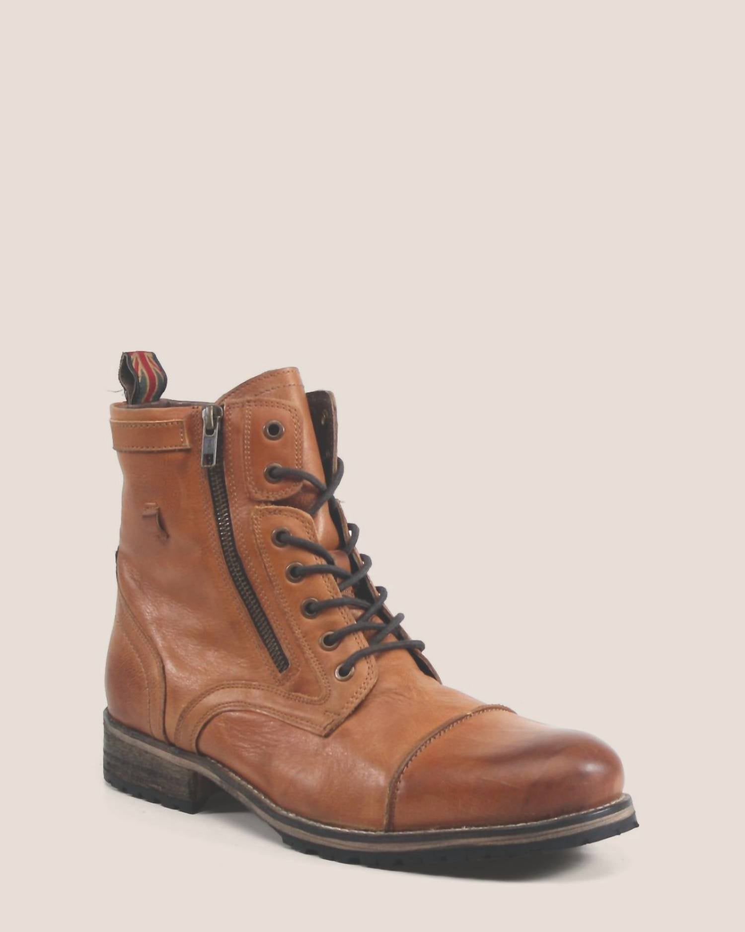 The Men's Pool Side Leather Boots by DIBA True are an embodiment of casually cool utility, crafted with attention in a vintage tan shade. These fashion logger boots feature a round toe, flat block heel, and double zip enclosure alongside a lace-up vamp and faux fur lining for extra warmth and style. Made from leather, these boots offer a medium width fit enduring all of fall's travels and Thanksgiving festivities.