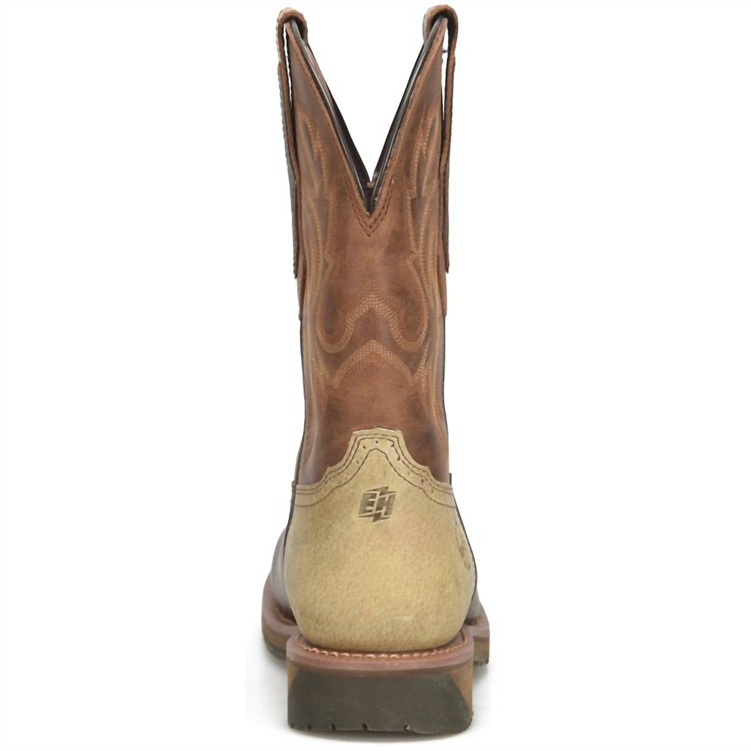 Introducing the Men's Outlook Comp Toe Boot by Double-H Boots, designed for optimal safety and comfort in a medium brown hue. With an 11-inch roper length, these boots feature a wide square composite safety toe and are crafted from durable leather, including dark beige vamp and terra cotta leather quarter. The Goodyear welt construction ensures durability, while the AG8 dual-density PU footbed and EVA midsole guarantee all-day comfort. Elevate your winter workwear with these expertly crafted boots, which provide reliable waterproof protection and an electrical hazard rating.