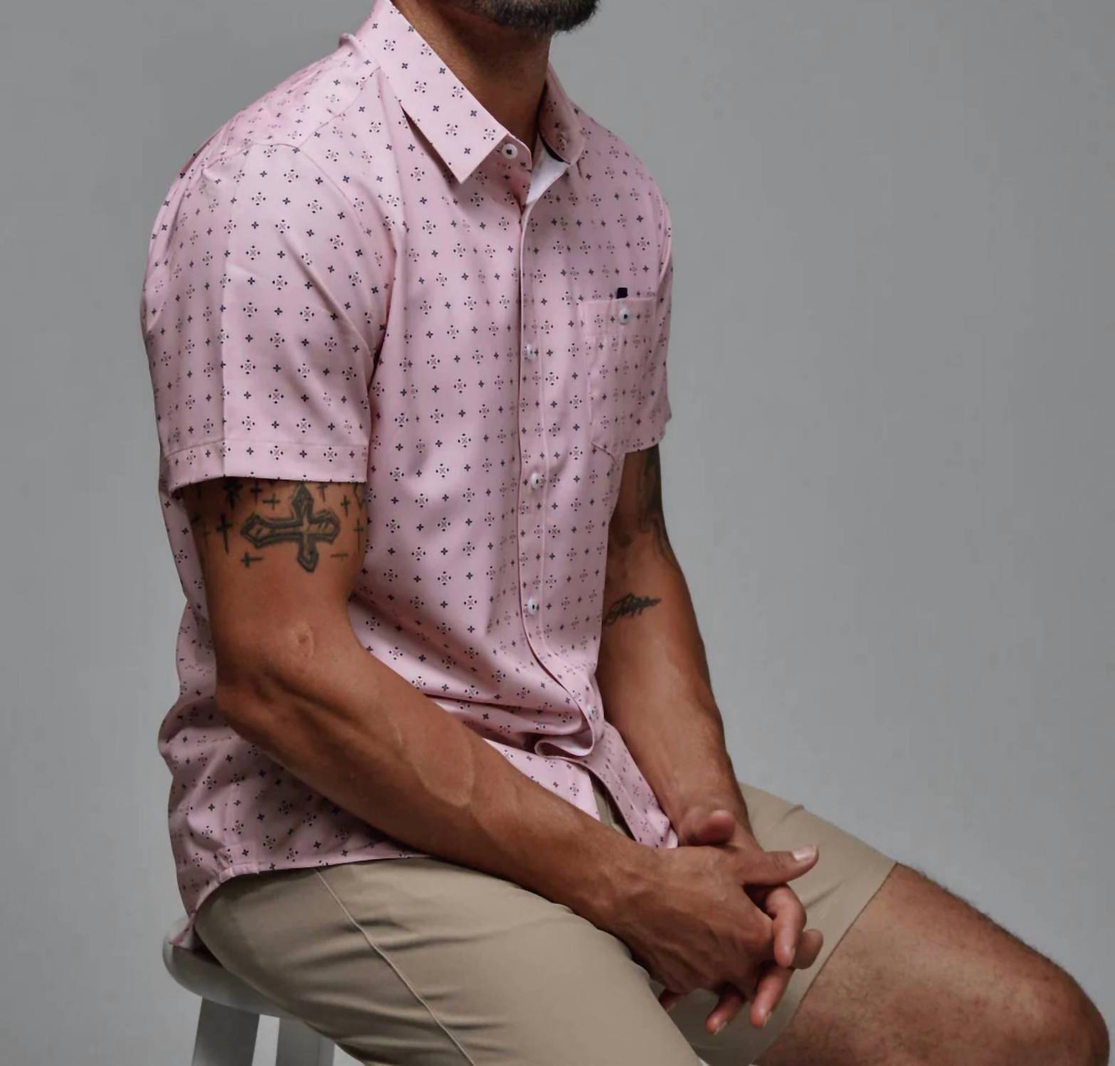Experience the ultimate blend of comfort and style with the Ronin Short Sleeve Shirt by 7Diamonds, an ideal choice for any discerning gentleman. Crafted from a high-quality composition of 94% Polyester and 6% Spandex, this rose-colored, patterned shirt offers impressive 4-way stretch for unmatchable comfort. Its classic collar and button closure design make it a versatile staple for any outfit. Care for your shirt with ease by machine washing cold on a delicate cycle, followed by a cool iron if needed and hanging to dry. Model is 6'1" and wears a size medium.