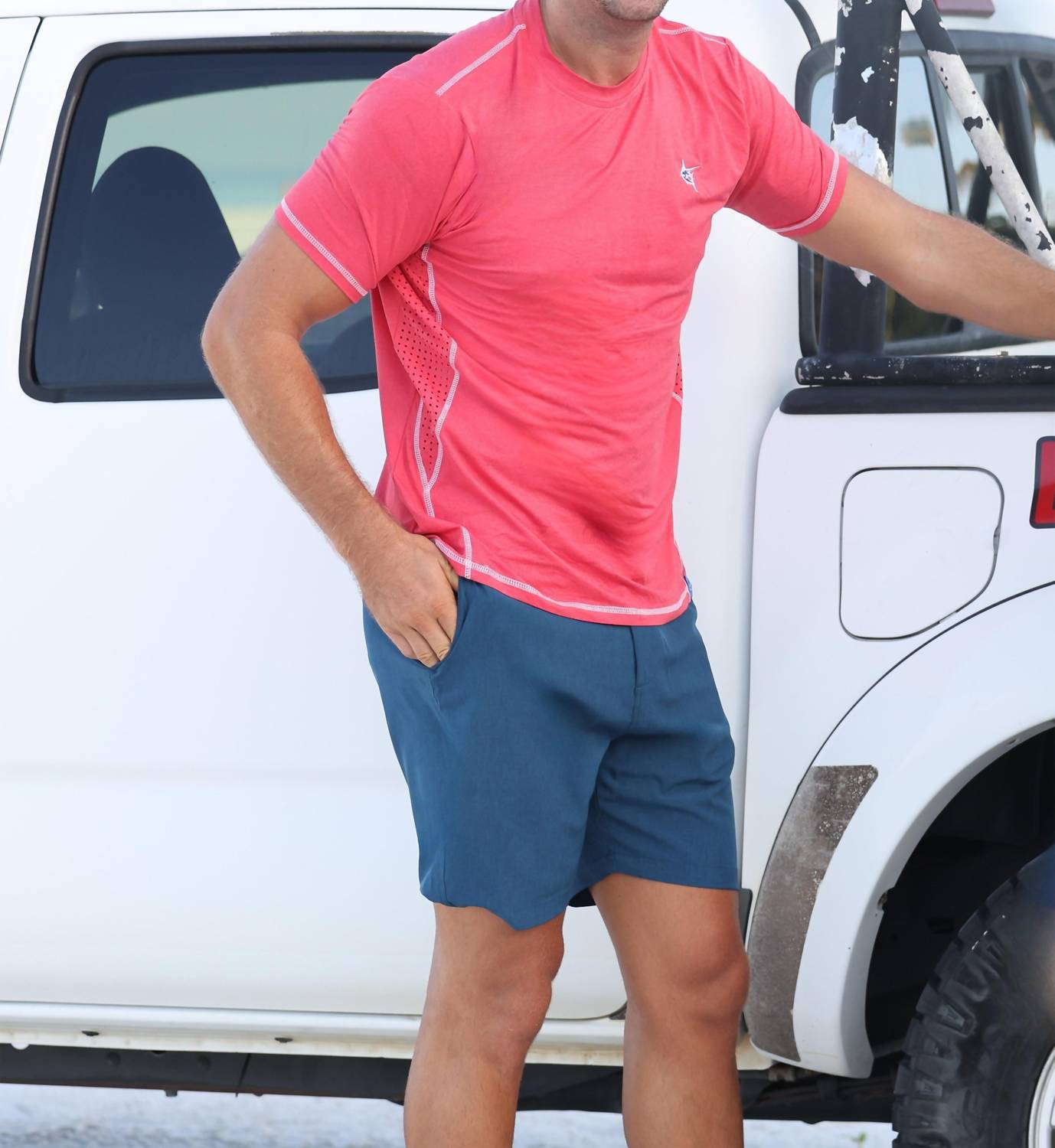 Introducing the Bayport Shorts by White Water Life, perfect for embracing summer in style. Designed for men, these solid navy shorts boast a seven-inch inseam and feature a button closure for a secure fit. Crafted from an incredibly lightweight, featherweight soft fabric with stretch, they ensure comfort and flexibility for any occasion. The shorts are equipped with functional pockets, including a zippered back right pocket with an embroidered Icon logo above it.
