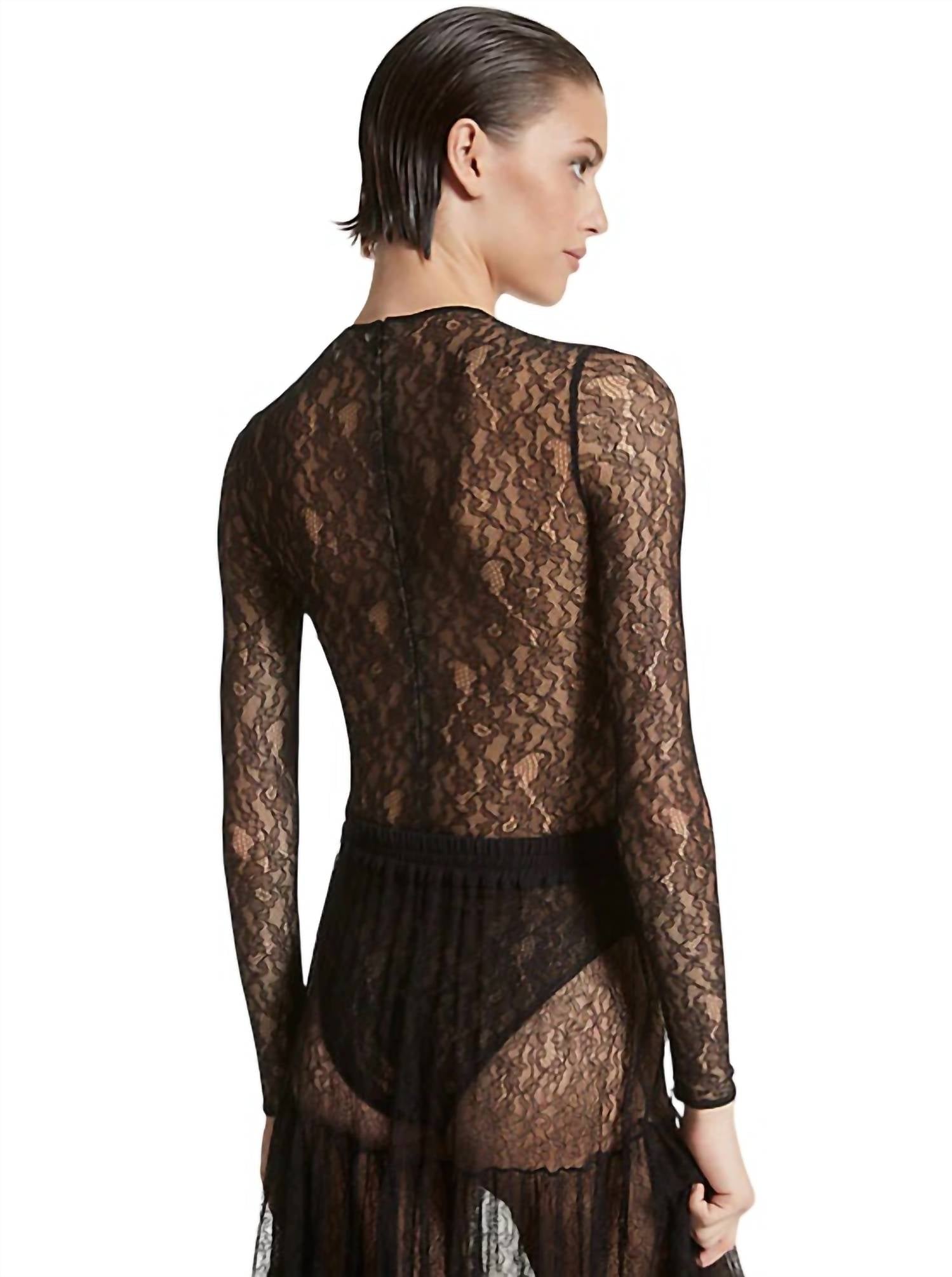 Form fitting and comfortable - this bodysuit check all of the boxes. Intricate Chantilly lace with a hint of stretch. Long-sleeve bodysuit. Tonal maxi skirt. 86% Polyamide 16% Elastane. True to Size.