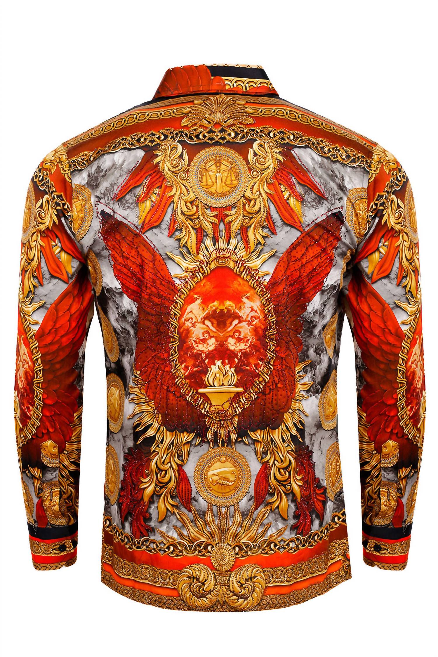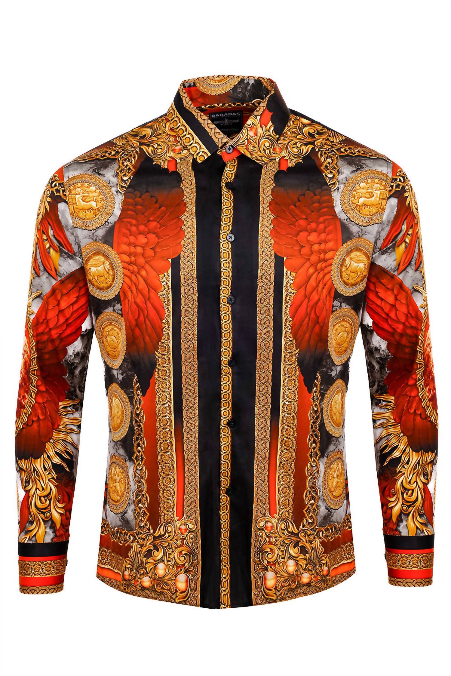 Introducing the Men's Striking Look Rhinestone Long Sleeve Shirt by BARABAS, a must-have for any holiday party. This red, long-sleeve shirt is crafted from 97% cotton and 3% spandex, offering a lightweight yet slim fit construction. The button-up design is embellished with hand-placed rhinestones in a Baroque style, complemented by unique angel wings and animal print details. Care for this luxurious piece with a dry clean approach to maintain its exquisite design and fit.