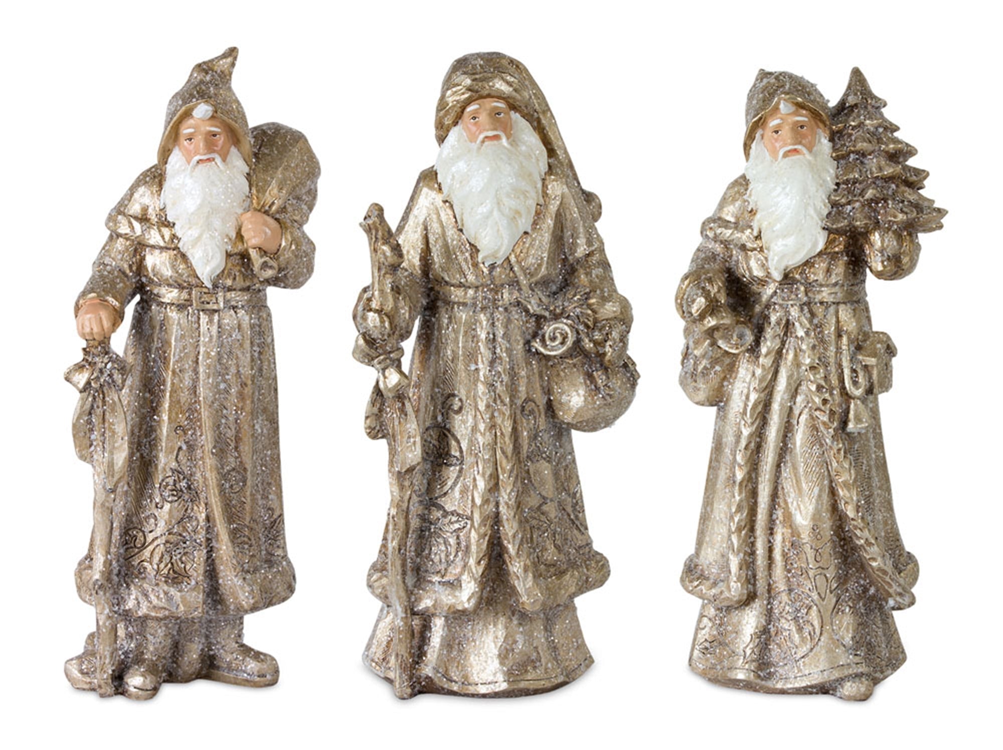 Add a touch of elegance to your holiday decor with this chic set of Stone Woodland Santa Figurines. Featuring three assorted designs—each Santa holding a pine tree, walking stick, or toy bag—this collection embodies the perfect blend of tradition and modern style. The metallic gold finish creates a timeless, festive look, while the durable polyresin and stone powder construction ensure these pieces will be treasured for many seasons. Display them together for a striking holiday centerpiece or spread the festive cheer throughout your home. Sold in a set of three assorted designs to make a statement in your home.