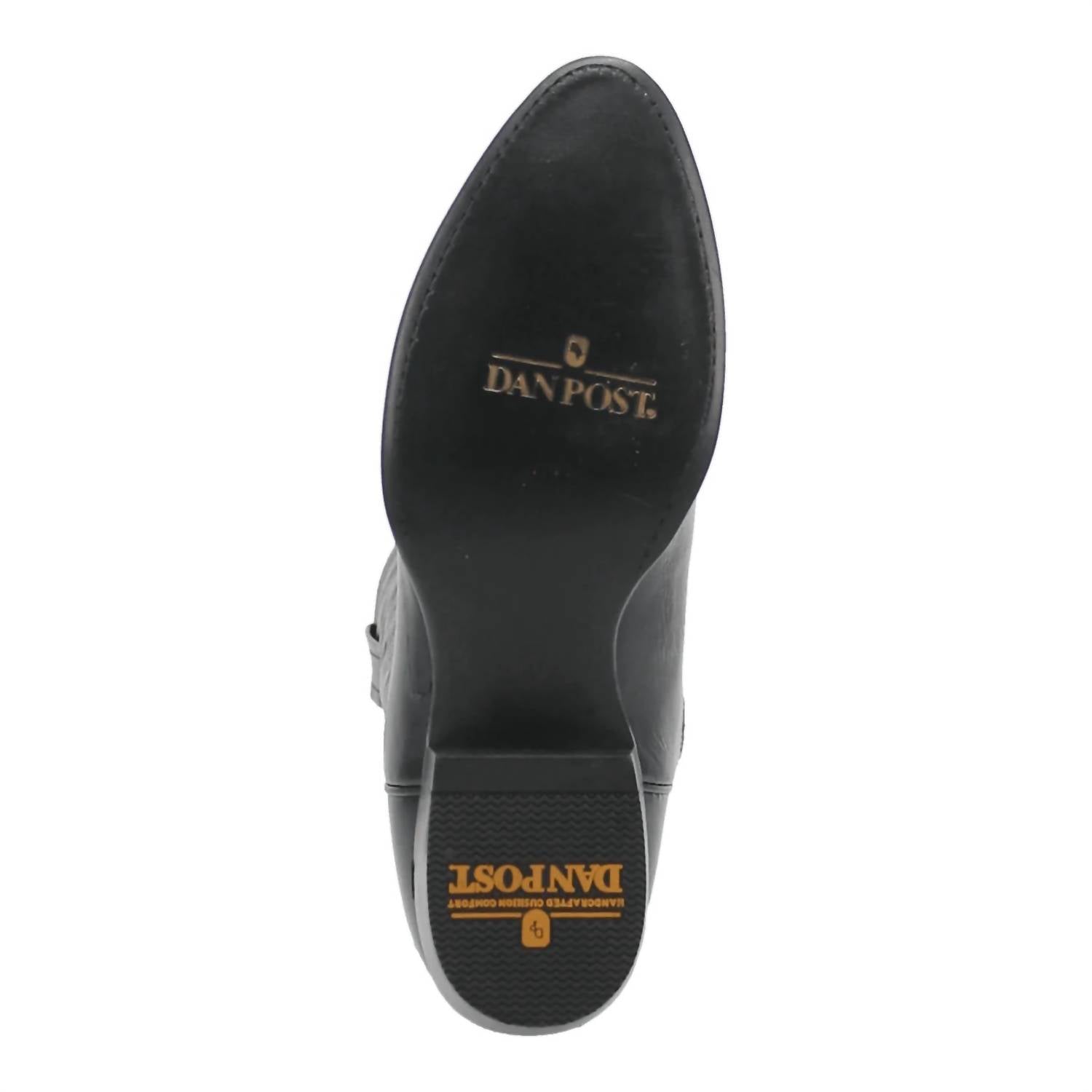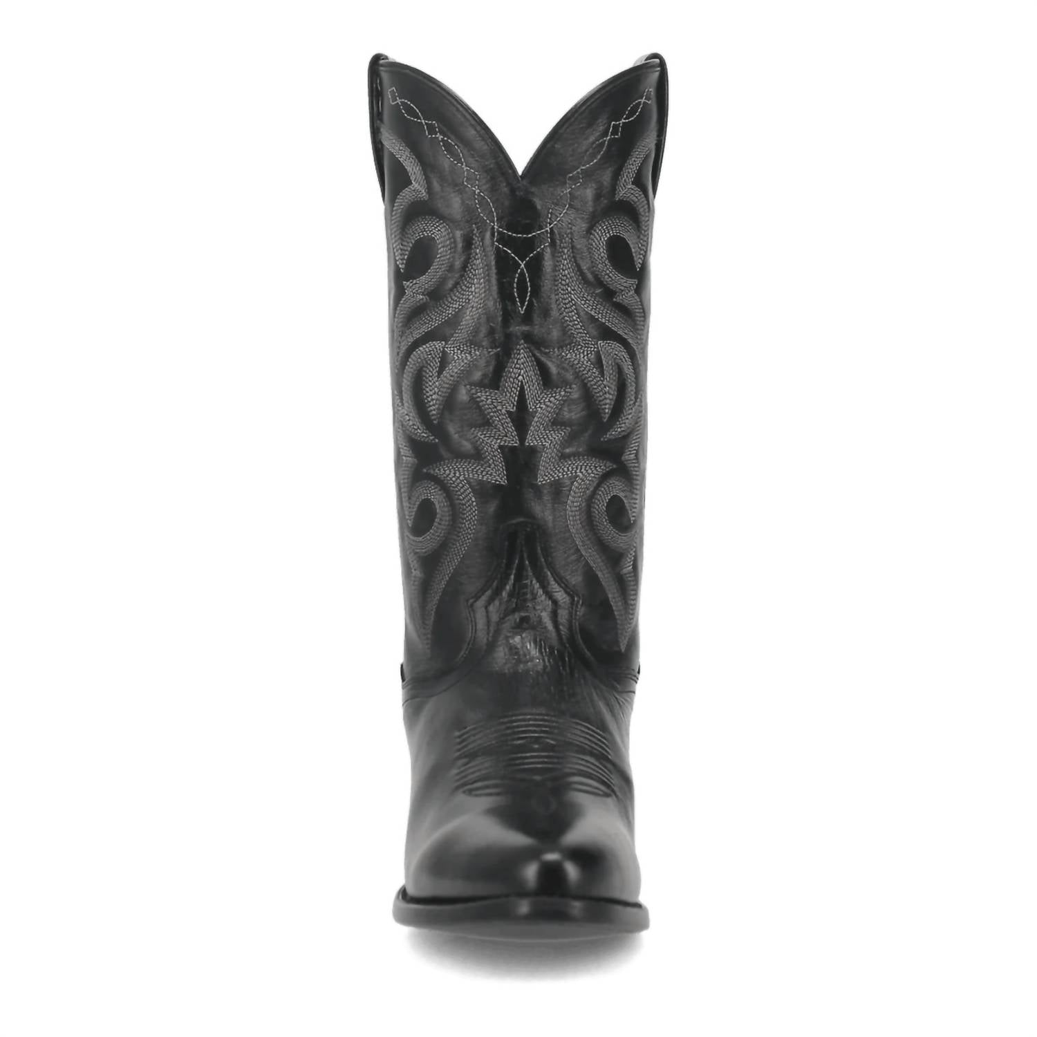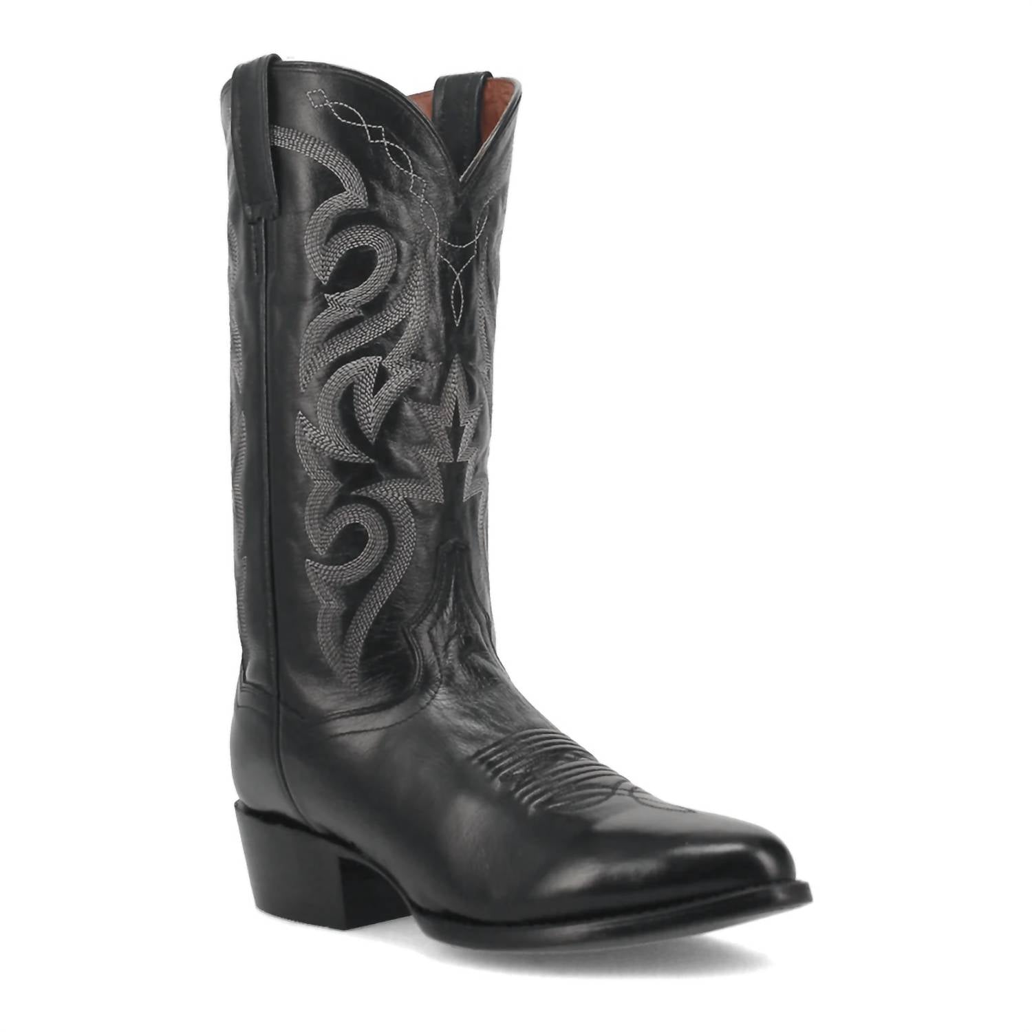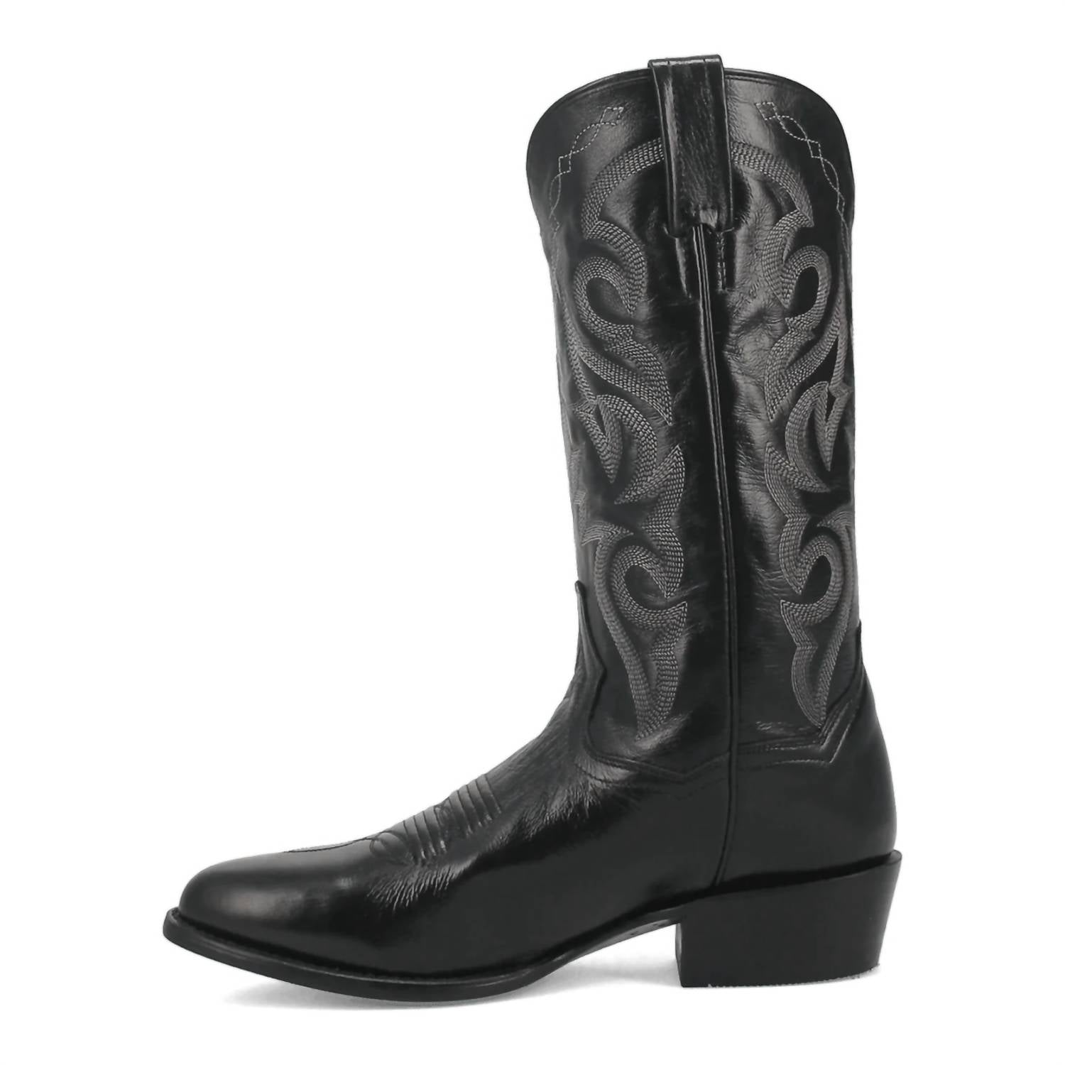 Introducing the Men's Milwaukee Western Cowboy Boots by Dan Post, a classic choice for any cowboy enthusiast. These boots are crafted in fine black leather with distinctive Western stitching and feature a comfortably rounded toe. The removable antibacterial and antifungal Soft Strike Orthotic ensures superior comfort, while the 1 1/4" cowboy block heel offers just the right lift. With a 13" shaft height and 13" circumference, these leather-lined boots are designed for durability and style.