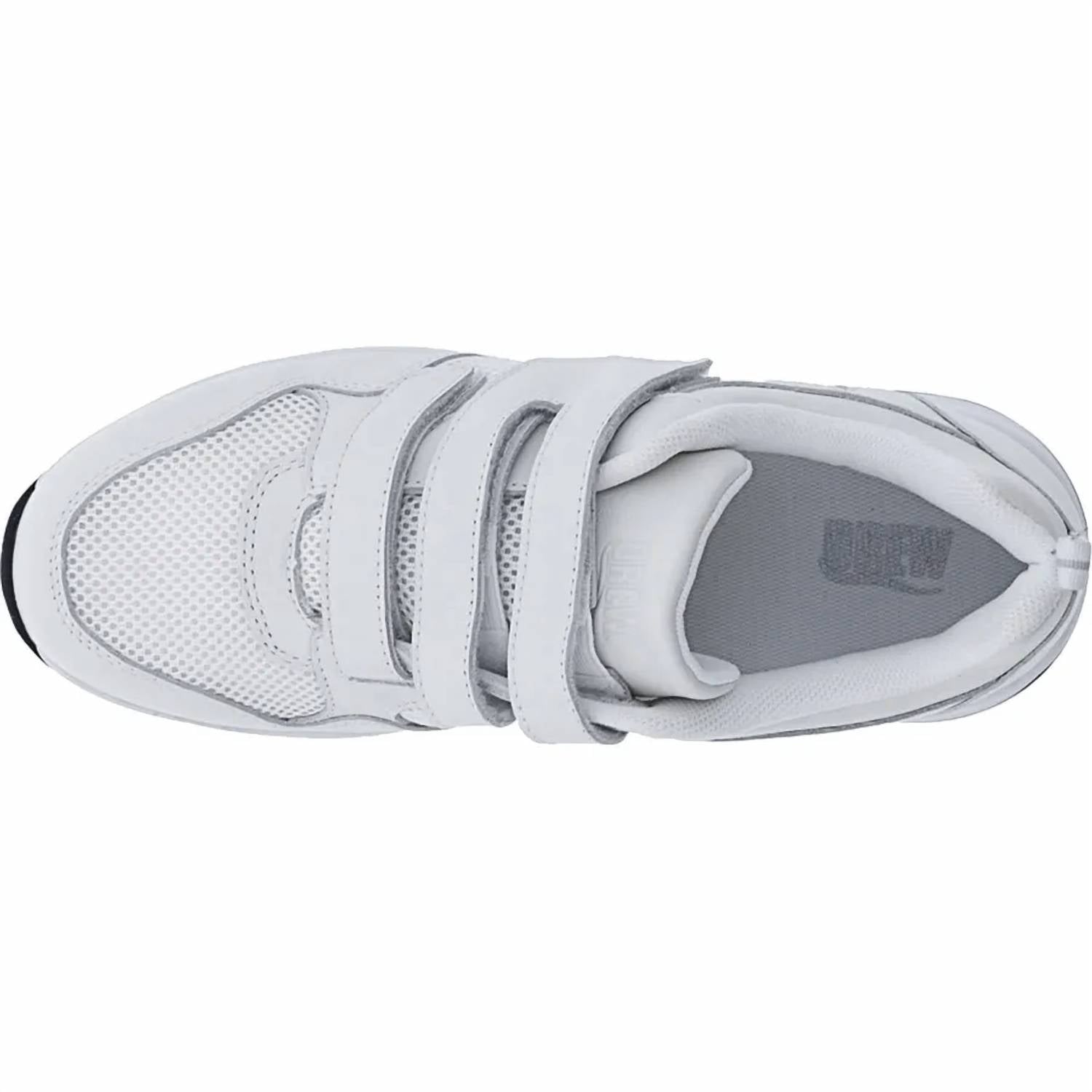 Introducing the Men's Rocket V Shoes by DREW, expertly crafted from premium white leather for ultimate durability and style. Designed with a round toe and platform heel, these athletic shoes offer a unique plus fitting system with two adjustable straps for easy wear. The Drilex-covered insoles, in collaboration with a removable ULTRON footbed, ensure comfort with built-in heel cushions and arch support. With a durable rubber outsole, EVA midsole, and a strong nylon shank, these shoes provide outstanding stability and accommodate prescribed orthotics for added convenience.