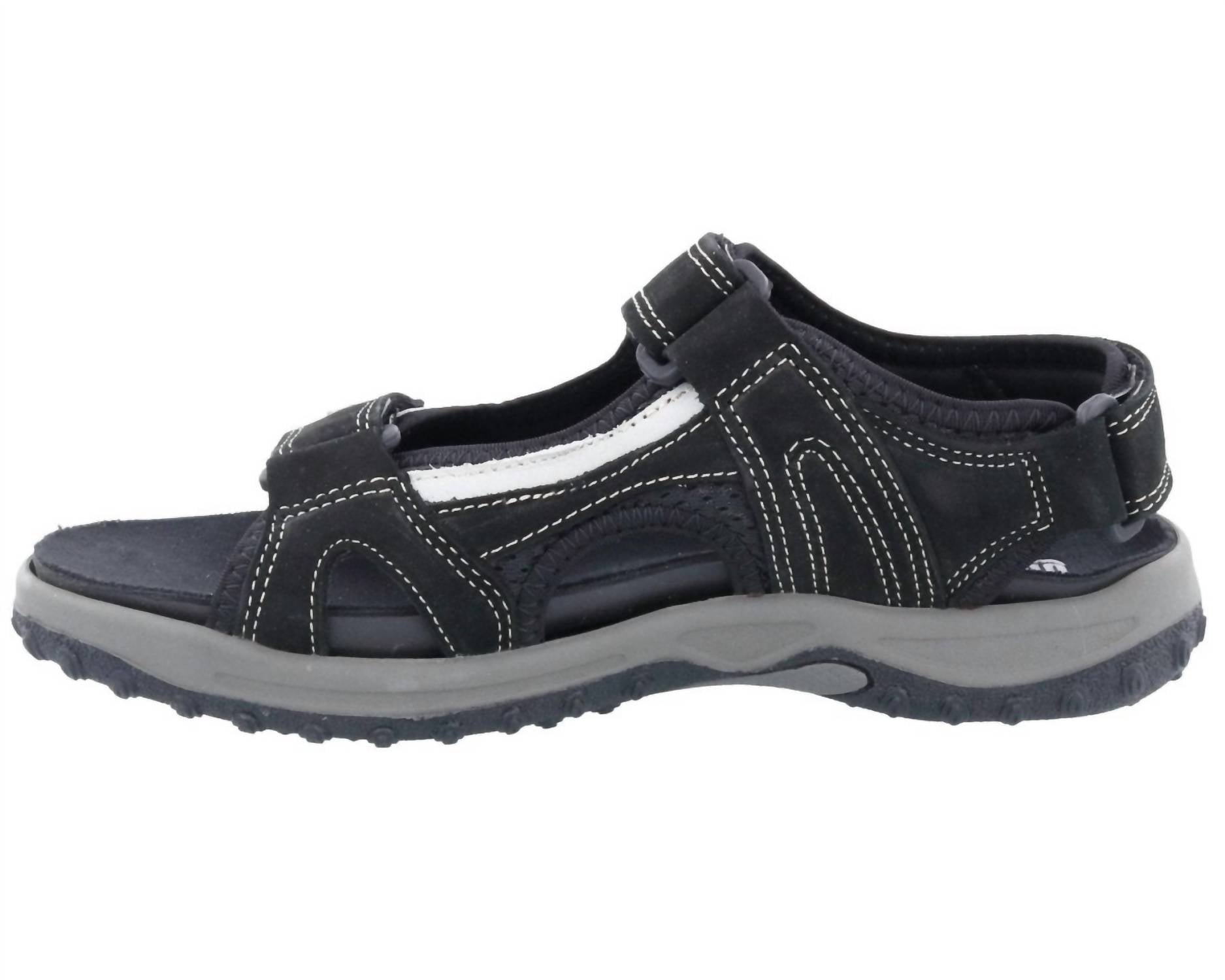 Discover the Men's Warren Sandals by Drew, expertly crafted for ultimate comfort and support. These sandals, available in an elegant black/grey nubuck, feature a genuine leather composition with three adjustable hook and loop closures for a custom fit. Designed with a broad-oblique open toe and a 1.25-inch flat heel, they ensure a stylish and secure stride. The removable, cushioned ULTRON® footbed alongside a flexible, shock-absorbing rubber outsole makes these an ideal choice for streetwear enthusiasts.