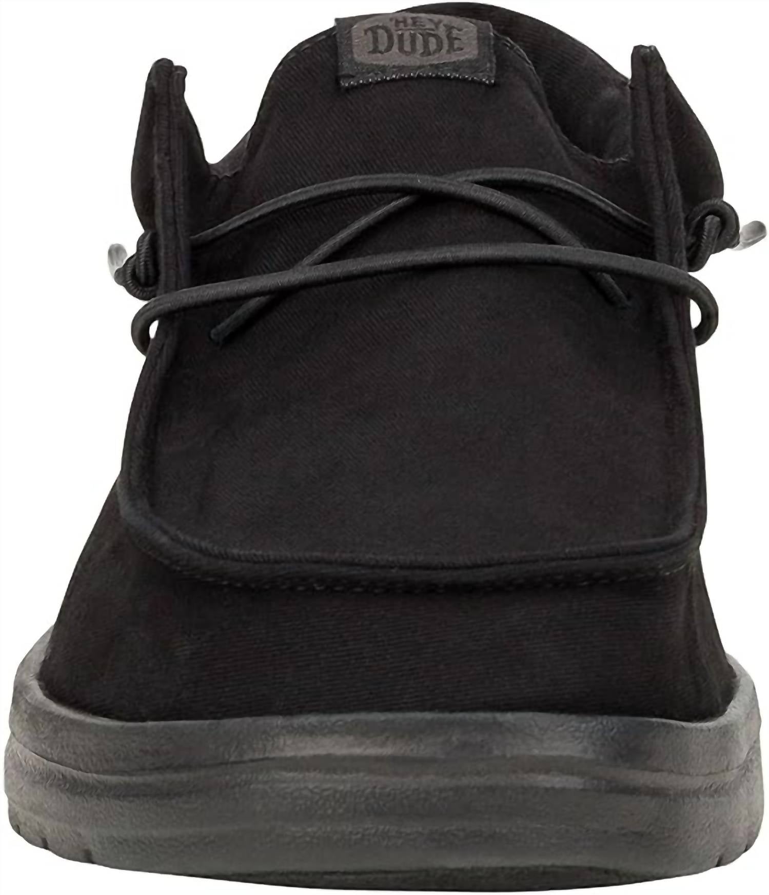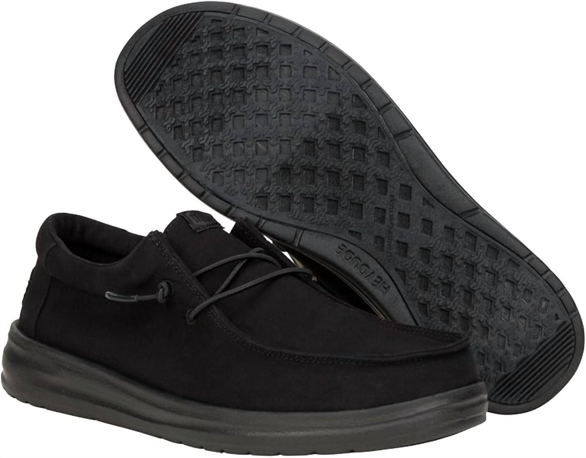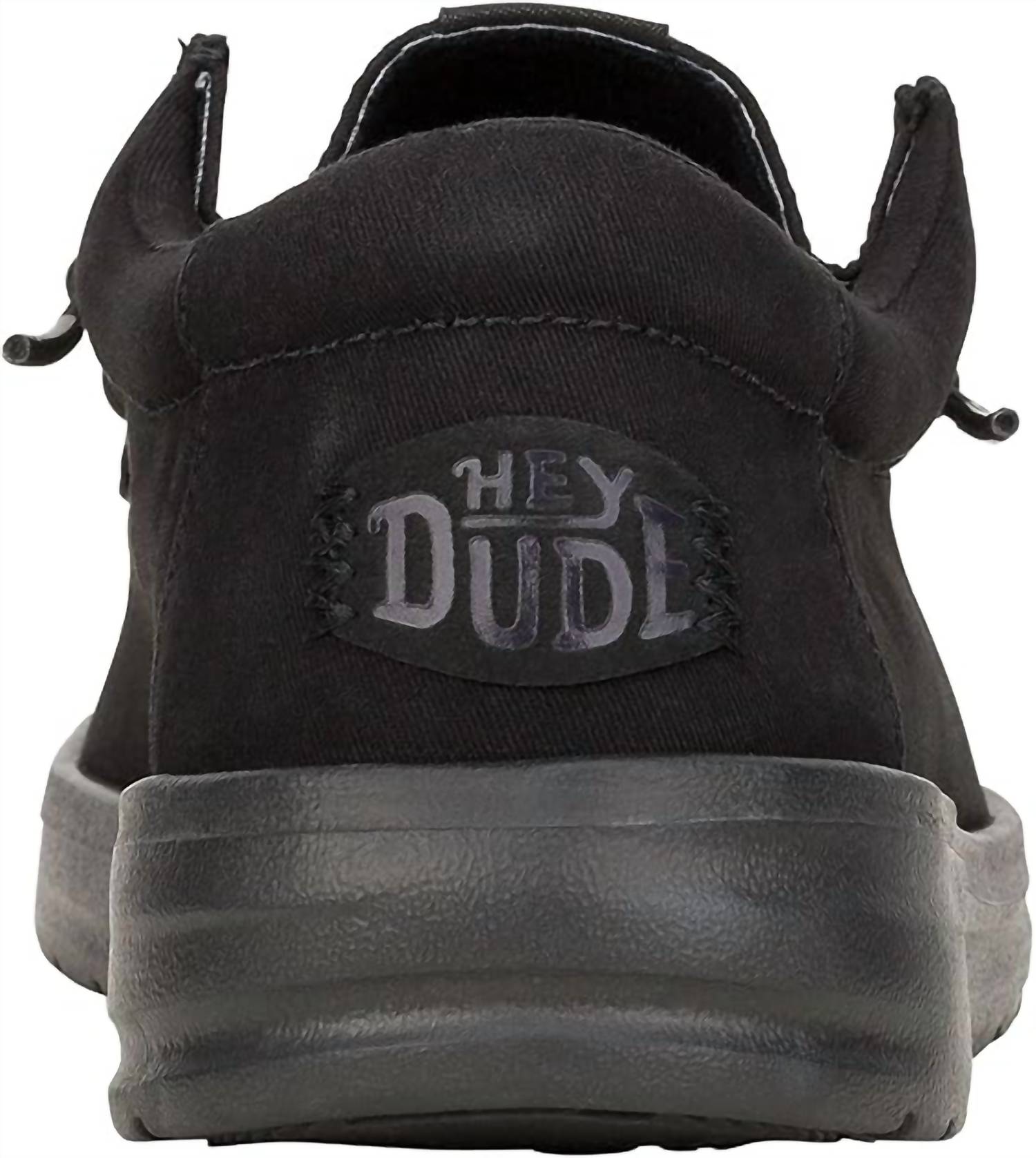 Step into ultimate comfort and style with the Men's Wally Work by HEY DUDE in Triple Black. These sneakers boast a treated canvas upper for water repellency, ensuring durability and a slip-resistant rubber grip outsole for excellent traction. Featuring a slip-on stretch lace closure and a cushioned ankle collar, plus a removable foam insole, these shoes guarantee a relaxed fit for all-day wear. Perfect for travel and fall workwear, they're an ideal Father’s Day gift option.