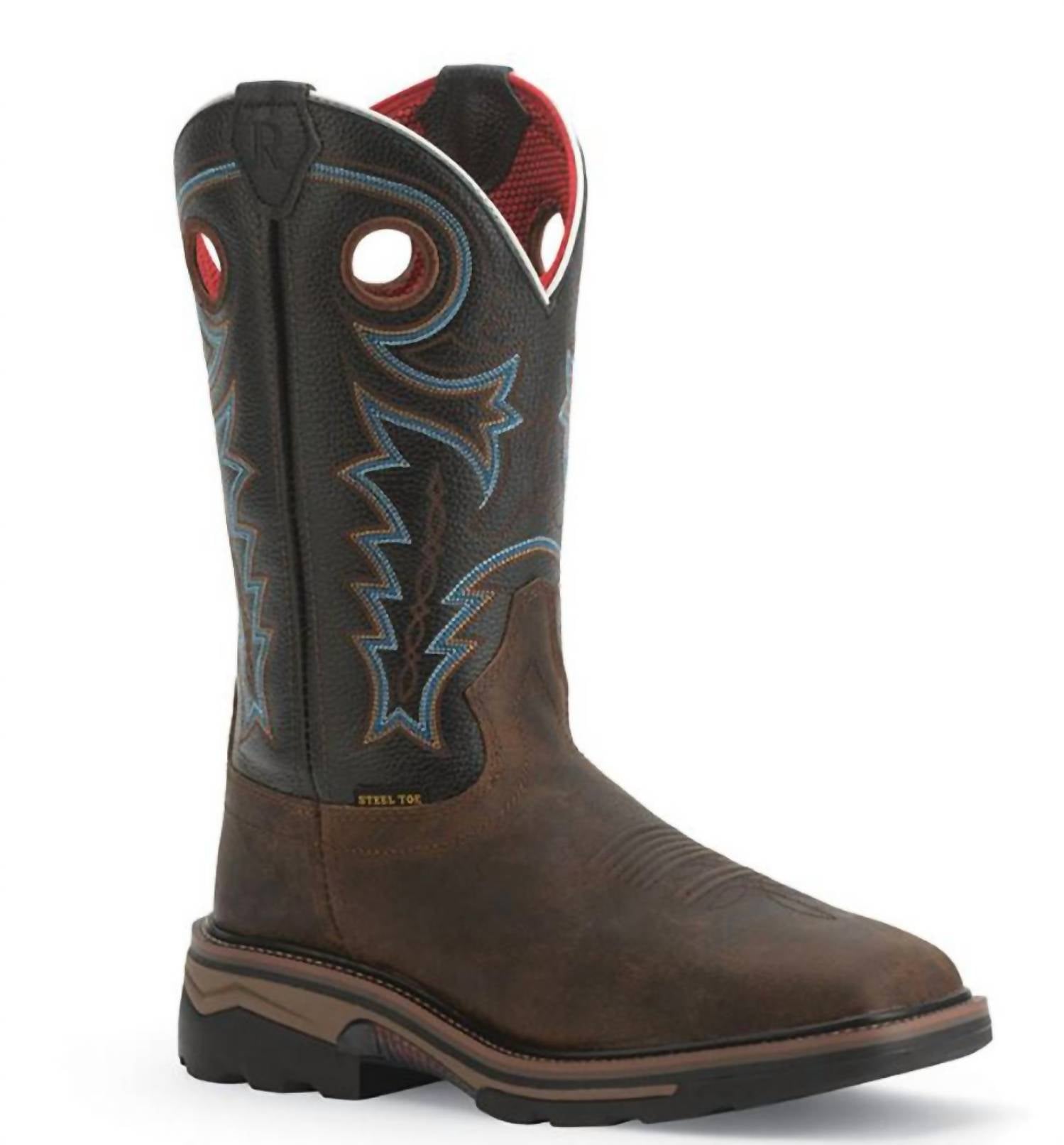 These 12" square toe work boots feature distressed buffalo and cowhide leather construction. Designed for durability and comfort, they include a 10-row stitch pattern, pull holes, removable orthotic insole, EVA midsole, and block heel.