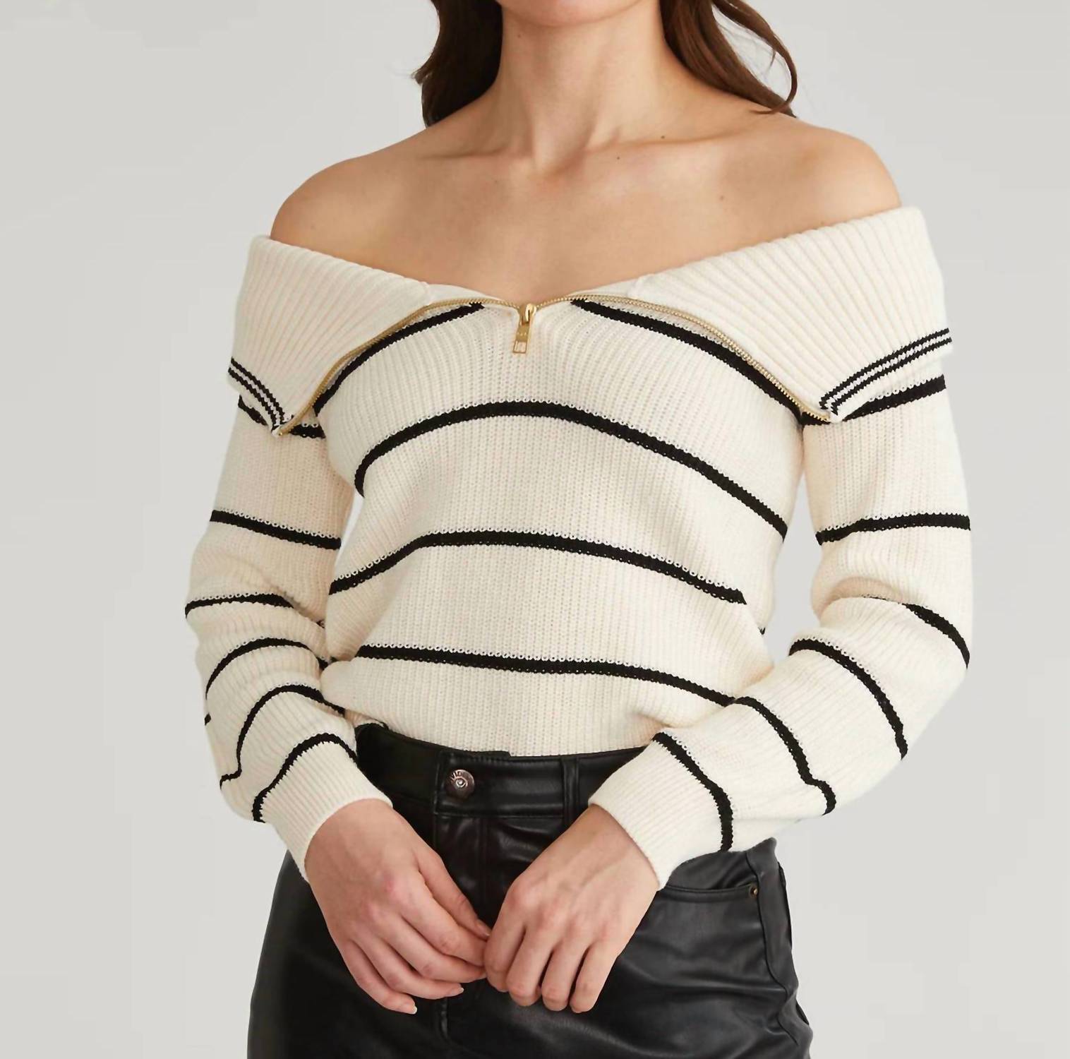 Show a little skin in this perfectly designed off-the-shoulder sweater. Crafted from 100% cotton, this long sleeve pullover features a stylish striped pattern and a zip closure, allowing you to customize the off-the-shoulder look. Its fitted design measures a garment length of 19.5 inches. Easy to care for, simply machine wash and tumble dry low.