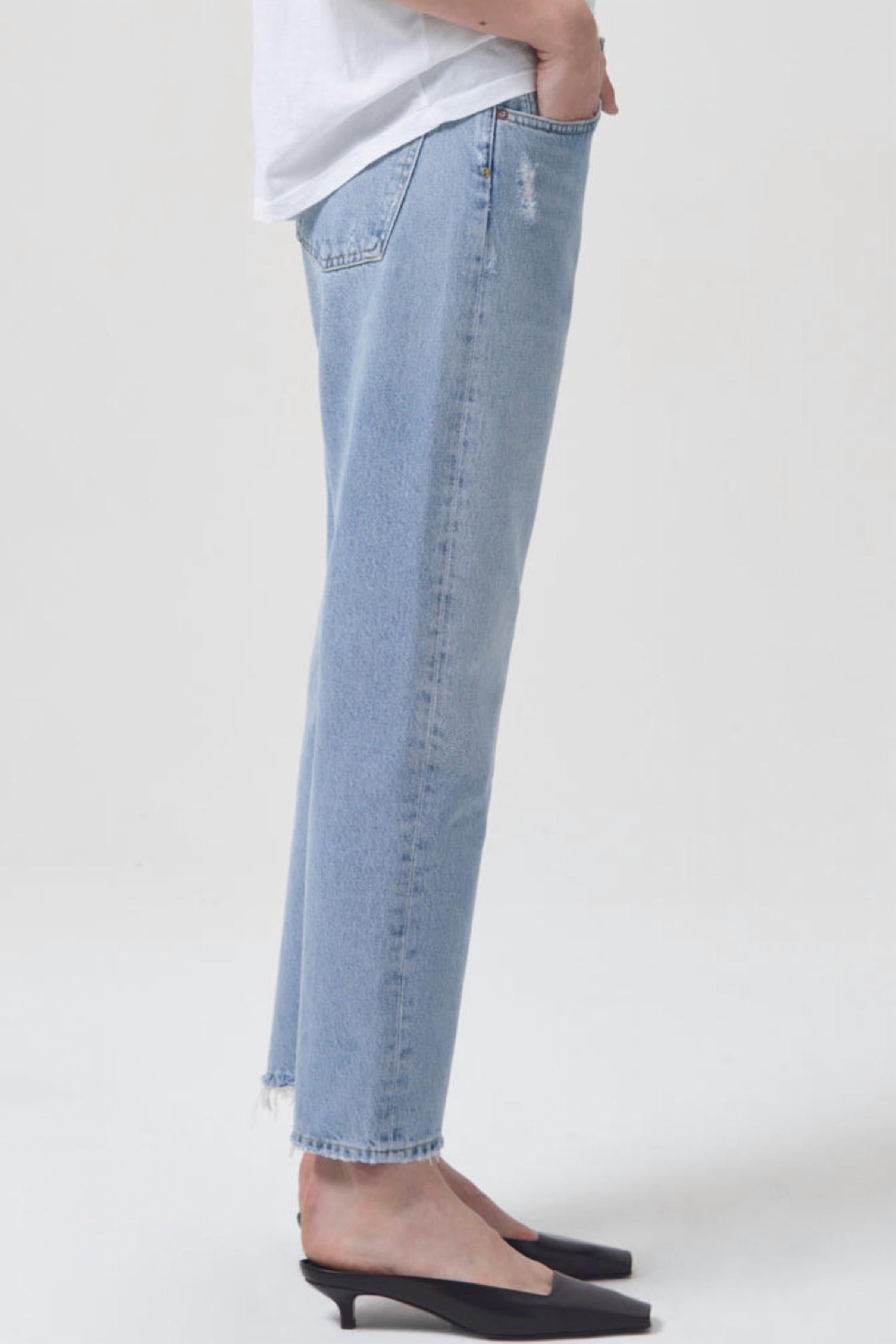Discover the Women's Parker Jean by AGOLDE, crafted from 100% cotton for ultimate comfort and breathability. This relaxed straight leg design features a light wash called "Swapmeet" and sits effortlessly at the waist. The jeans are equipped with a button fly closure and a cropped hem, made to wear low on the hip with dimensions of an 11 1/8" rise, 26 1/2" inseam, and 14 1/2" leg opening. Perfect for your spring vacation wardrobe, these jeans are imported and easy to care for with machine wash cold and tumble dry low instructions.