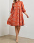 Introducing the Sienna Floral Design Tiered Midi Dress by Baevely by Wellmade, a stunning addition to any wardrobe. This rust-colored midi dress features a charming floral pattern and three-quarter sleeves with elastic cuffs. Crafted from polyester, it offers a soft and comfortable fit with a button closure at the front. Perfect for vacation or any occasion, its cozy corduroy fabric and tiered A-line silhouette are sure to impress. Care: Hand wash and line dry.