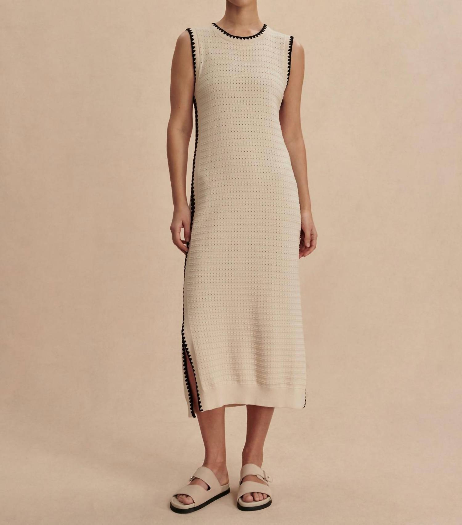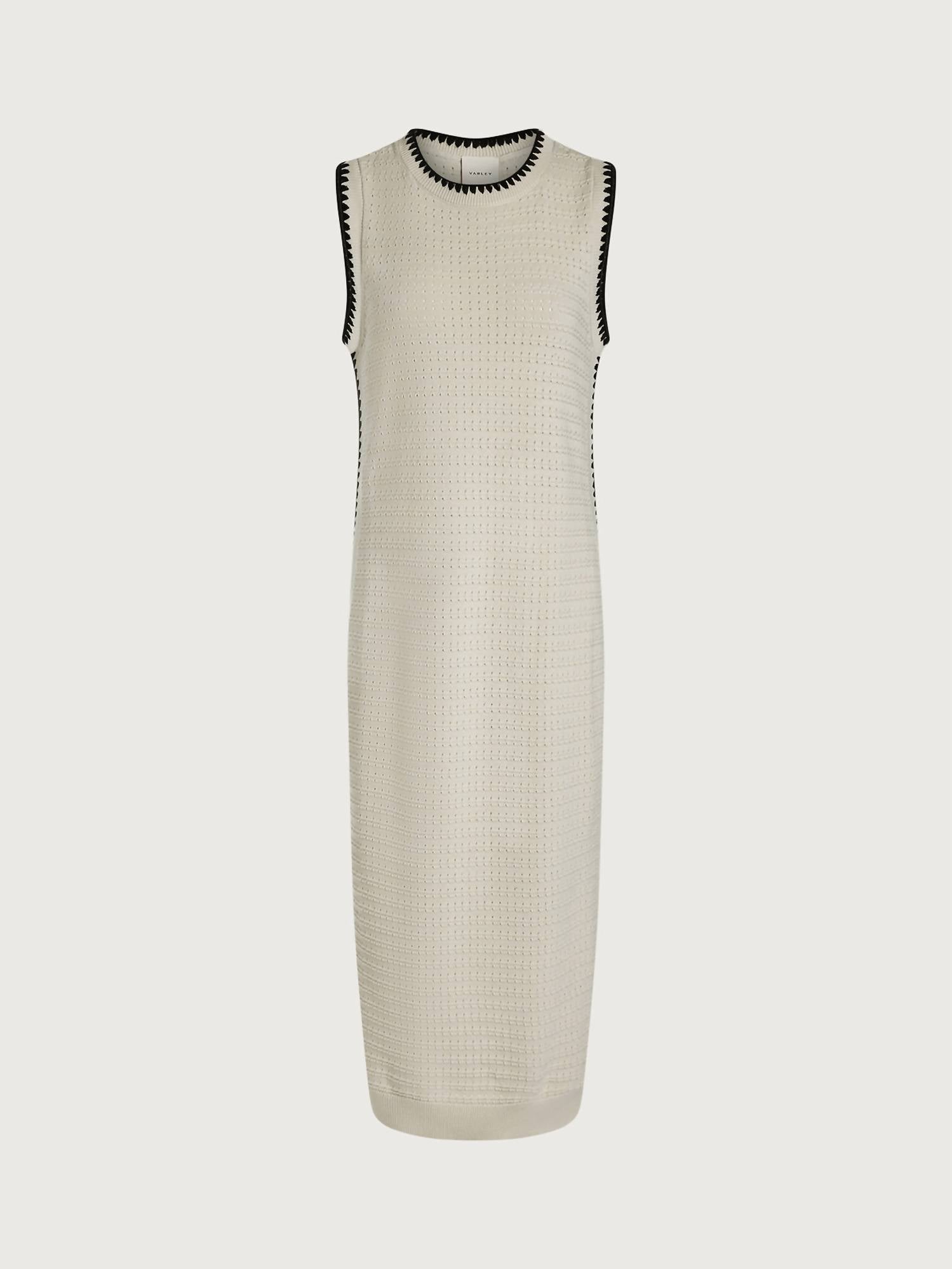 Discover the Dwight Tank Knit Midi Dress by VARLEY, a striking addition to your summer collection. This sleeveless dress, crafted from 100% Cotton, features a refined textured crochet design in a chic birch hue. Its flattering A-line silhouette provides an elegant 48.4-inch length, complemented by a crewneck and sleek black piping accents. This pull-on piece, perfect for boho chic vibes, is ideal for holiday parties and requires machine wash with a lay flat to dry instruction.