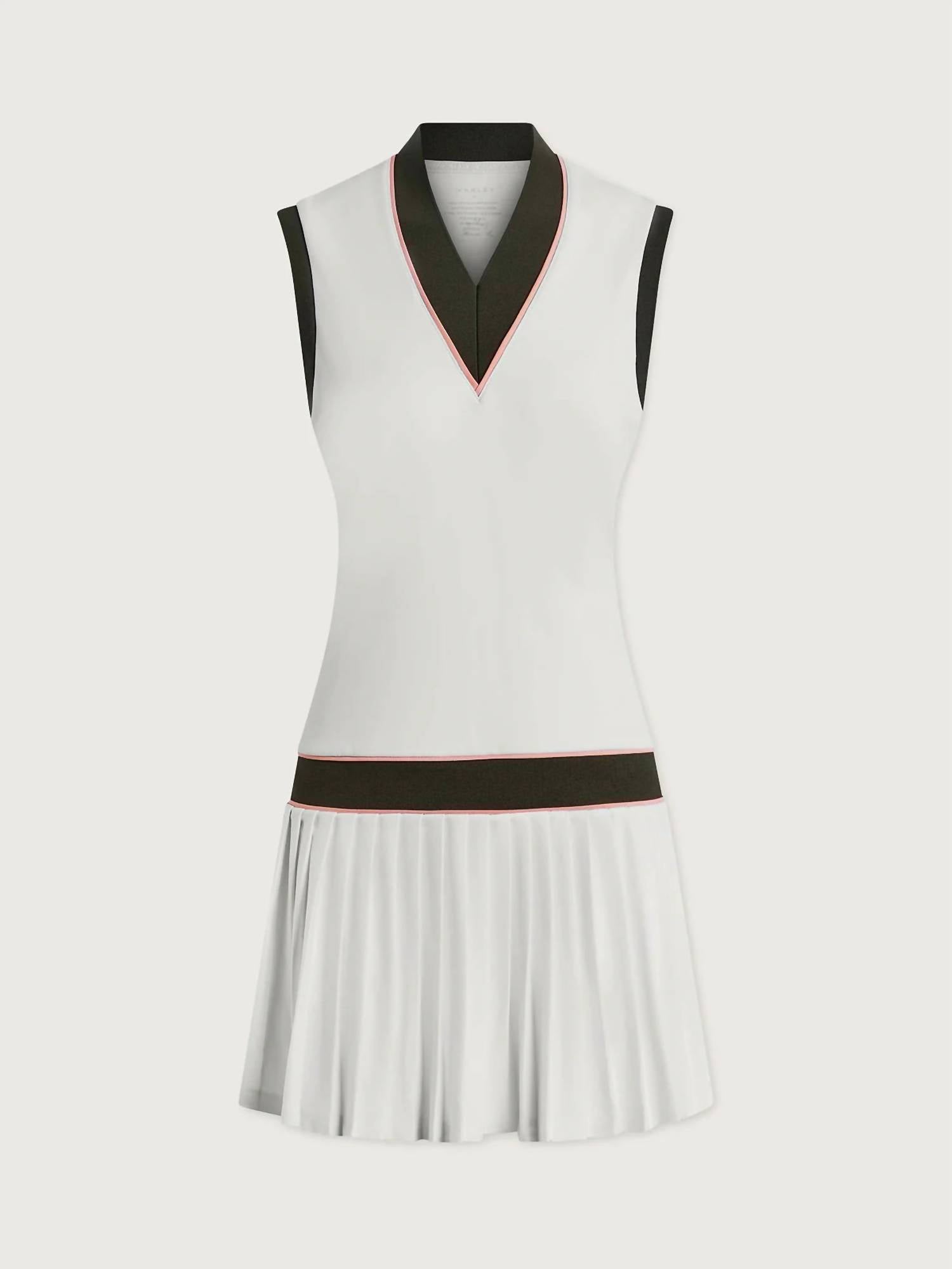 The perfect mini dress for those warmer months. Experience the perfect balance of style and comfort with the Jouri Court Dress by Varley, ideal for game day athleisure. This sleeveless mini dress with a V-neckline and A-line silhouette features rib trims and contrast piping, made from 52% recycled polyester, 36% polyester, and 12% elastane. The pull-on style includes a clever 2-in-1 feature with an attached removable short inside secured by snap loops. Care instructions: Machine wash. Length: 32.5 inches.