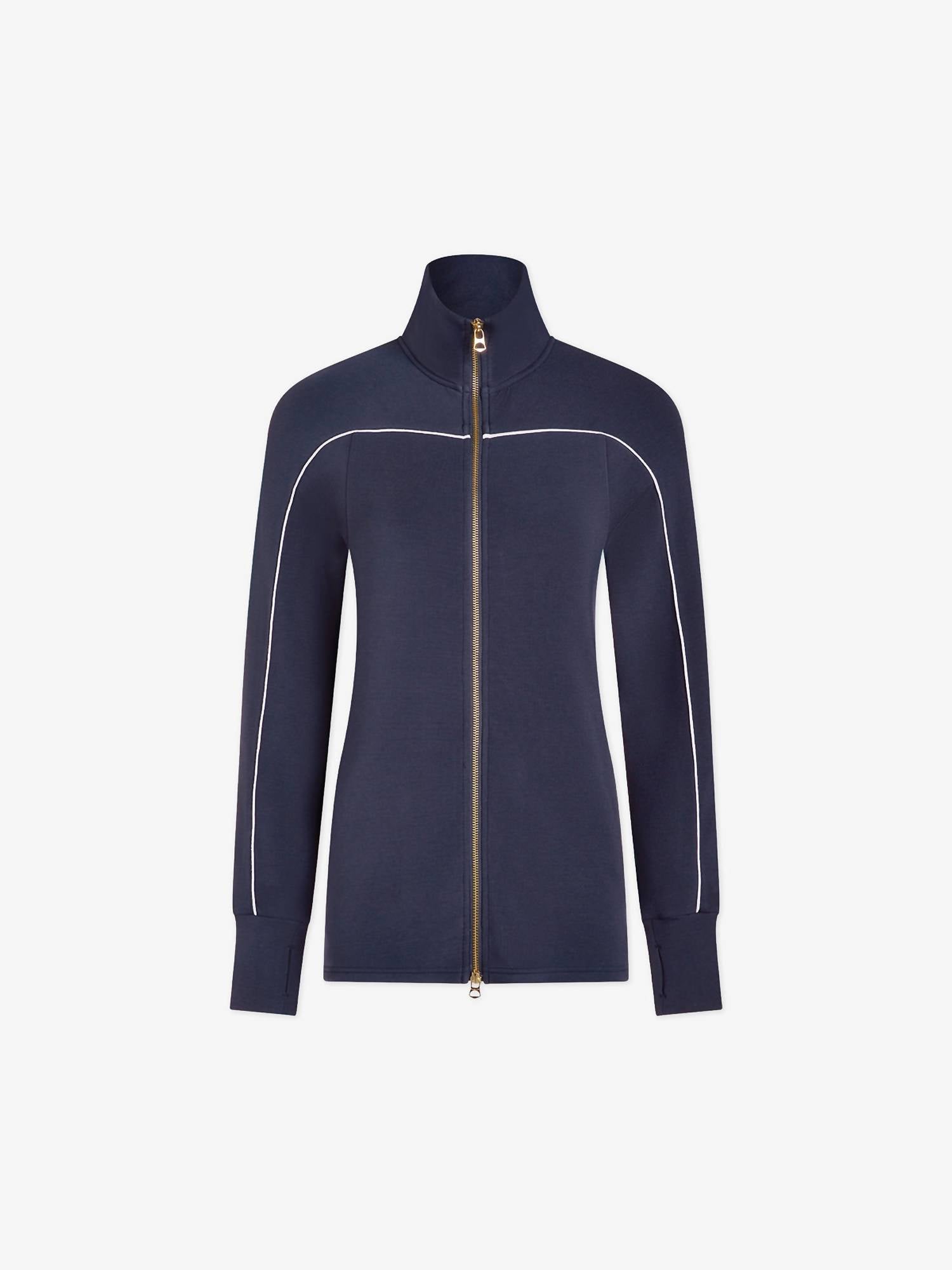 Introducing the Palmdale Zip-through Sweat Jacket by Varley, crafted for the modern woman in a sophisticated Blue Nights hue. This utility jacket features long sleeves and a sleek zip closure for added convenience, along with ergonomic thumb holes. Made from a comfortable 72% Viscose, 23% Polyester, 5% Elastane, it has a garment length of 26.4 inches that offers a flattering fit, versatile for workouts or casual outings. Care instructions include machine washing and laying flat to dry.