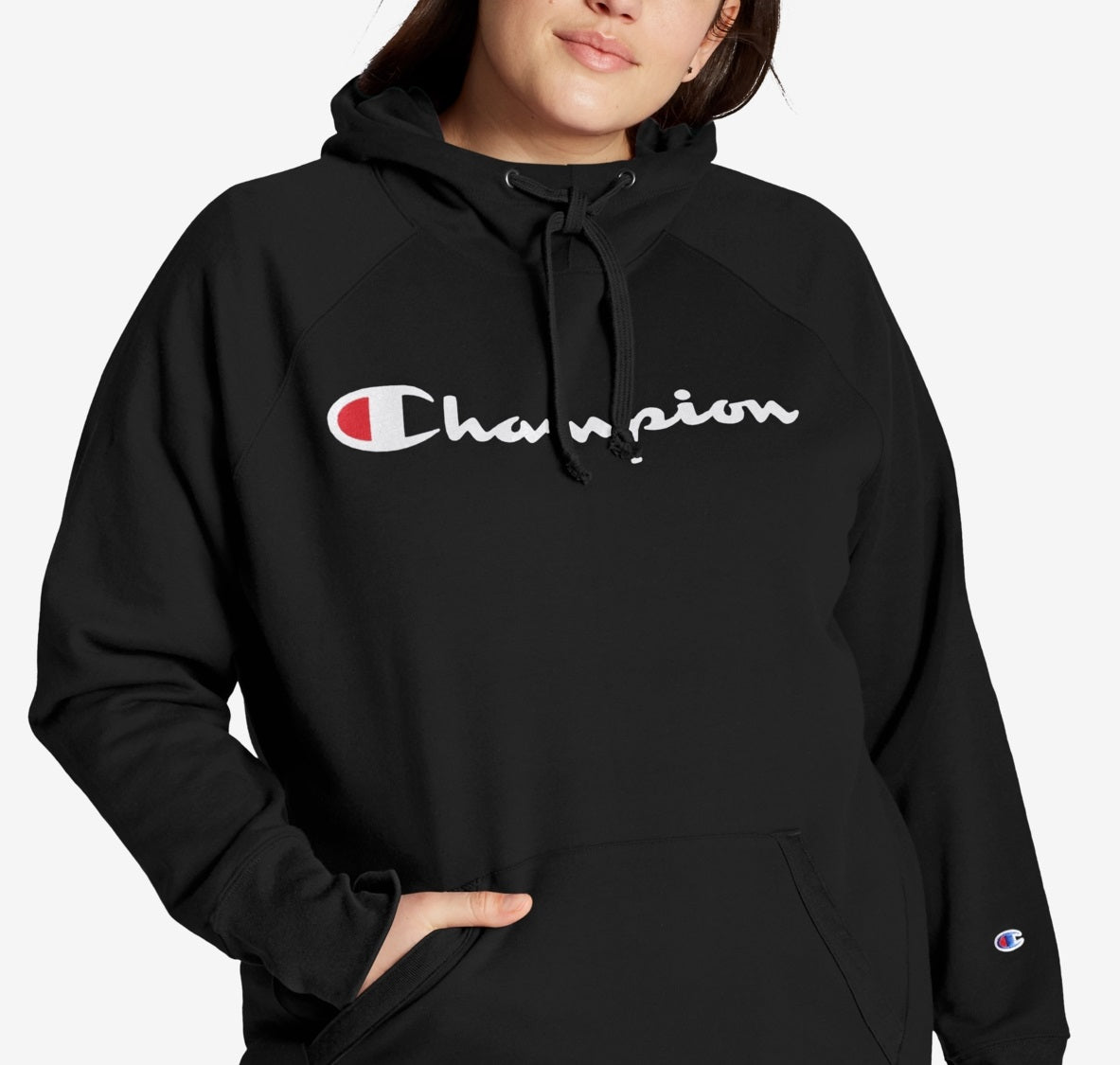 A script logo updates this go-to from Champion| a plus size hoodie with a hip-length silhouette for added coverage.| Hits at hip| INSPIRED FOR; Athleisure| Lined drawstring hood; kangaroo pocket; logo at front| Polyester/cotton| Machine washable