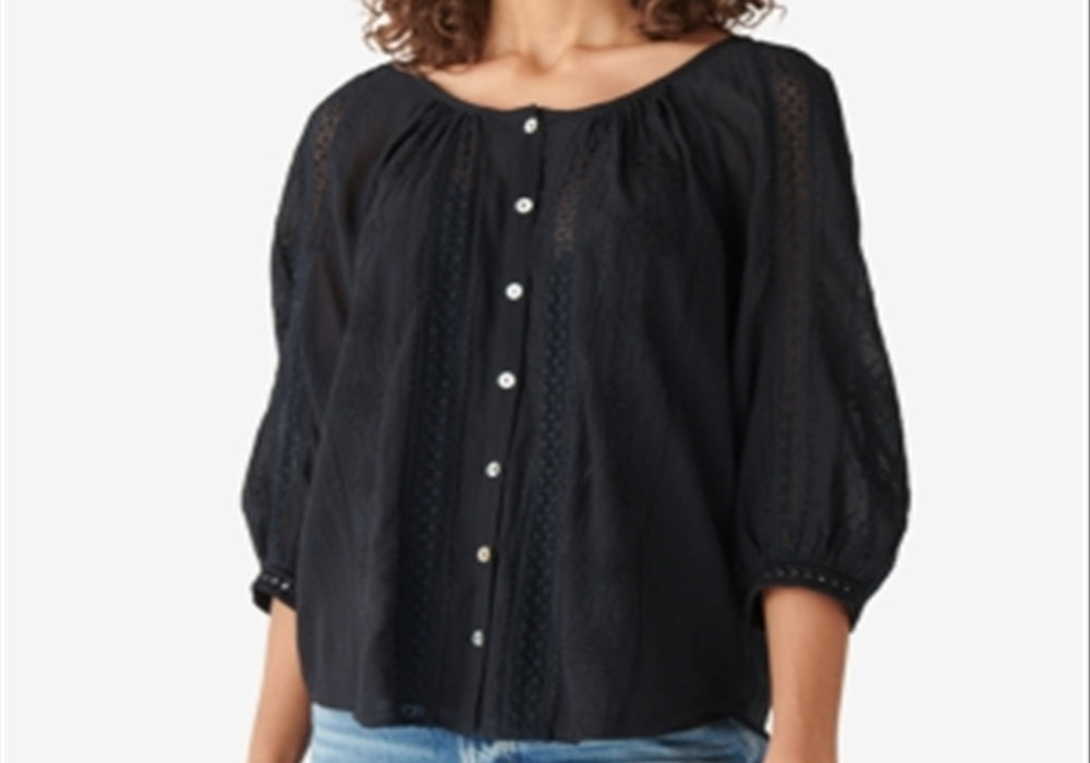 Lucky Brand Women's Lace Inset Embroidered Blouse Black Size M