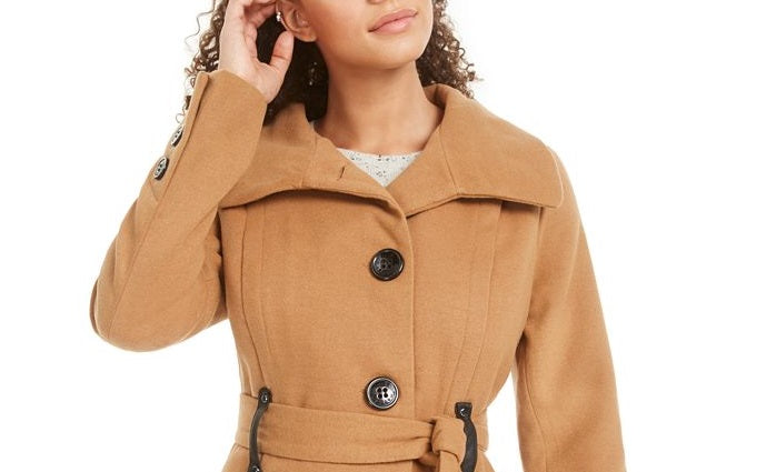 Deliver on drama| all year round. Madden Girl's chic skirted coat flatters your curves| while cute buttons and a chunky tie pull it all together. | Approx. length; 36-1/2 from center back to hem | Wing collar; asymmetrical button closures at front| Removable belt