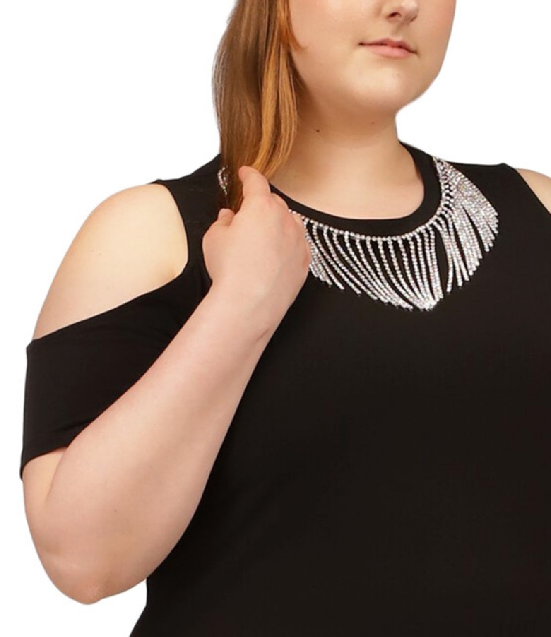 Score some fringe benefits in Michael Kors' cold-shoulder plus size top.| Approx. 27 long| Crewneck with rhinestone fringe| Short sleeves with cold-shoulder cutouts | Polyester/elastane| Machine washable or dry clean| Imported