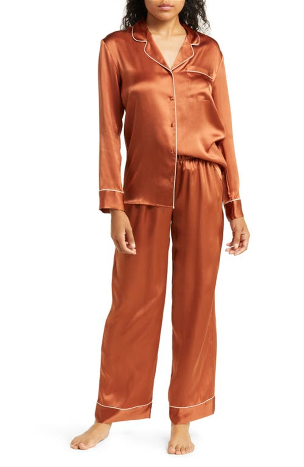 The Nordstrom Classic Silk Pajamas in Brown Coconut offer a luxurious sleep experience with their exquisite silk fabric that's soft to the touch. Designed with a menswear-inspired aesthetic, these pajamas exude timeless elegance and sophistication. The top features a notched collar and long sleeves, providing both comfort and style for lounging at home or enjoying a good night's sleep. Ideal for warm nights, the whisper-light material enhances breathability, while the durable silk ensures long-lasting quality. Easy to maintain, these pajamas are machine washable, making them a practical choice for the modern individual.
