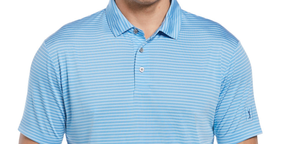 Stylish feeder stripes and moisture-wicking fabric with built-in sun protection make this golf polo shirt fromPGA Tour the perfect choice for style and comfort on or off the green