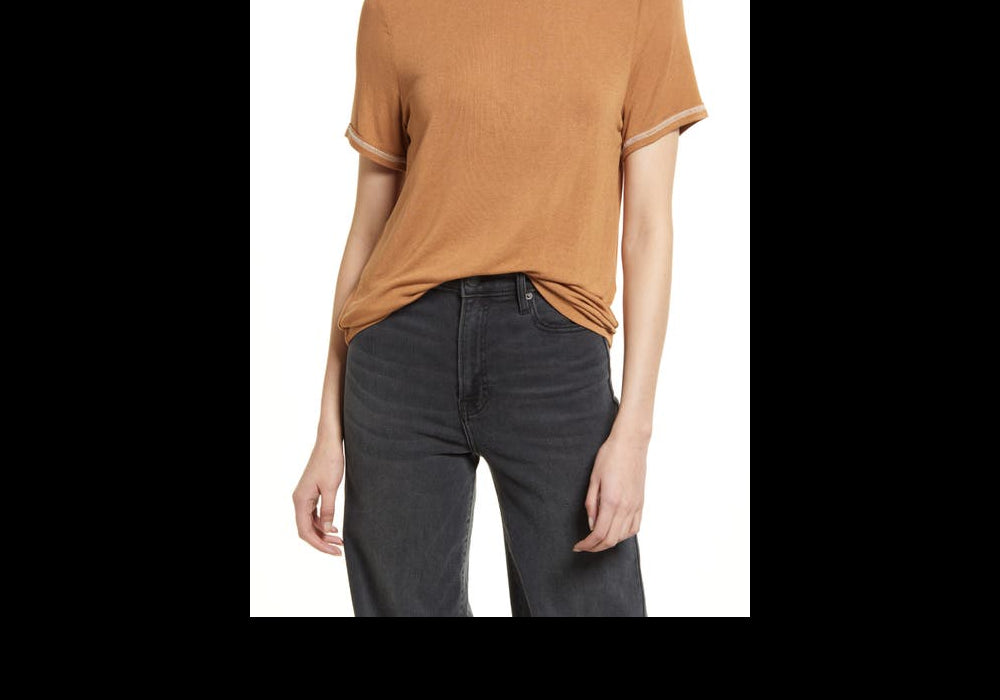 The Treasure & Bond Semi Sheer Crewneck T-Shirt is a stylish and comfortable addition to your wardrobe. Made from a soft, stretch-hinted knit, this t-shirt boasts a unique overlock stitching design that adds flair to the neckline and sleeves. With a flattering fit and a length of 26 inches (size Medium), this t-shirt is an ideal choice for casual outings and layering. Designed with a crewneck and short sleeves, it provides both comfort and versatility for any season. Plus, when you purchase this t-shirt, a portion of the sales goes to charities that aid youth empowerment, embodying the brand's commitment to social responsibility. This product meets Nordstrom's Give Back criteria, making it a conscious choice for consumers.