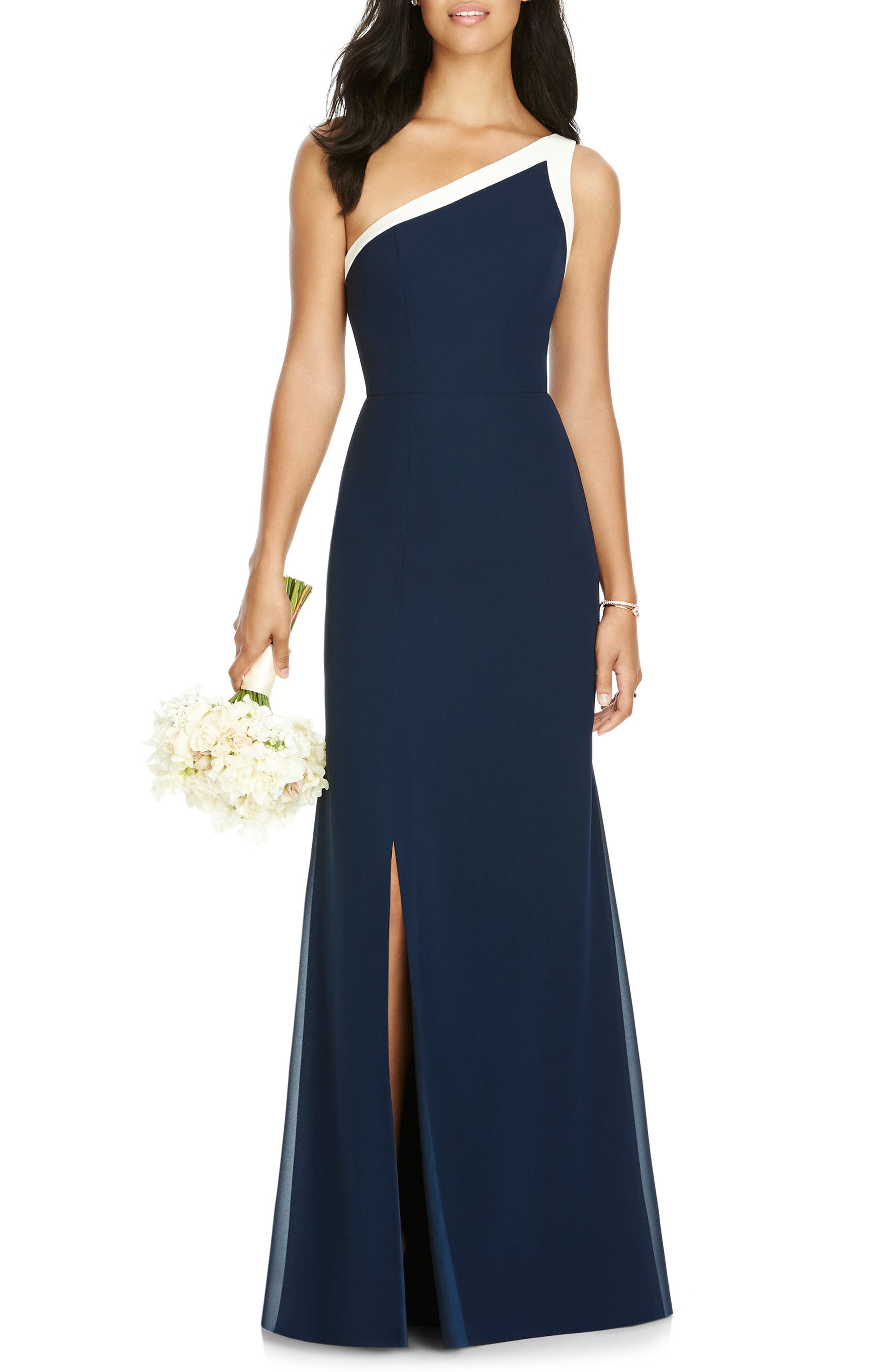 Alfred Sung Strapless Satin Twill A-Line Gown in Midnight, Size 8