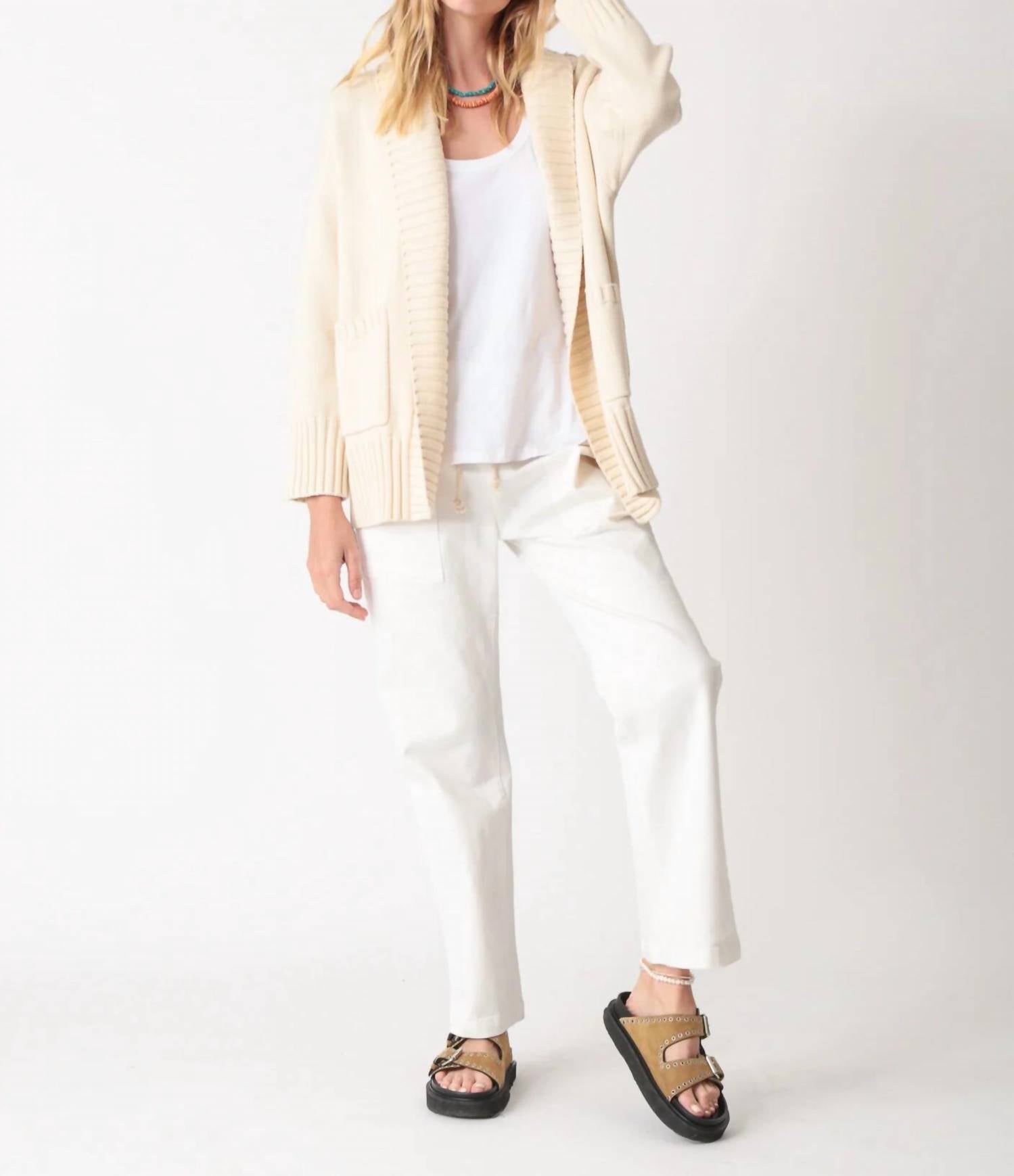 The Shay Cardigan by Electric & Rose elevates any outfit with its chic graphic pattern and sophisticated bisque hue. Designed with a long sleeve and a classic collar, this cardigan is expertly crafted from a 95% organic cotton and 5% cashmere blend, ensuring luxurious comfort. This travel-friendly piece is perfect for spring outings and offers easy care as it requires dry cleaning. The model, standing 5'9", is wearing a size small, showcasing its timeless fit.