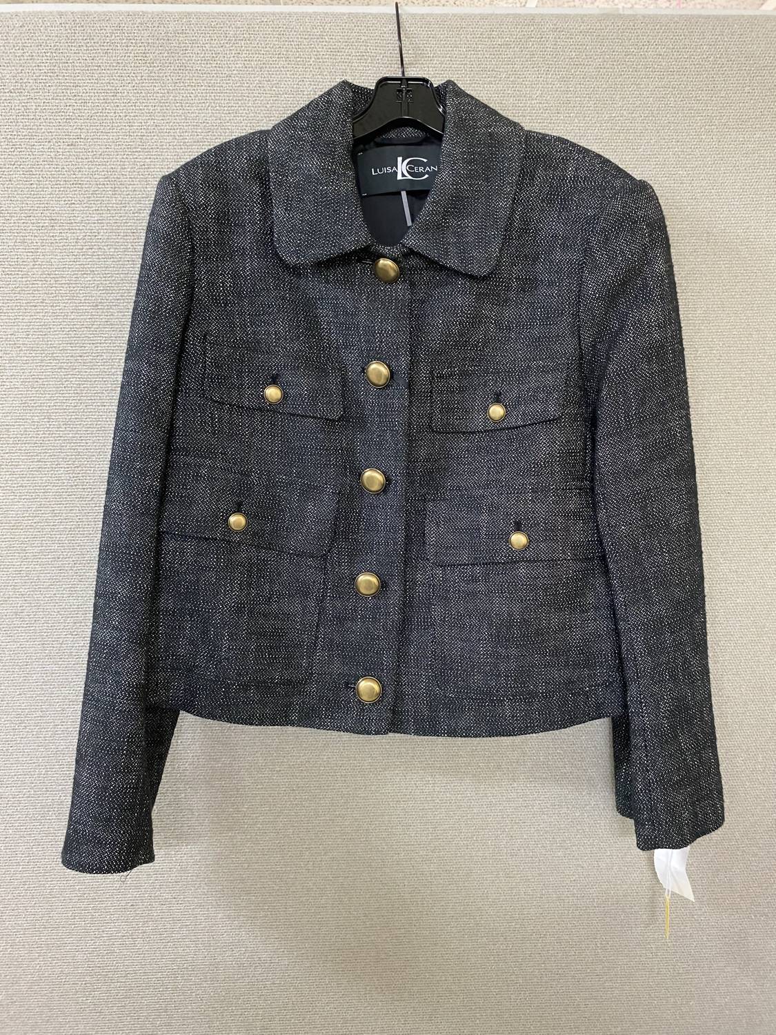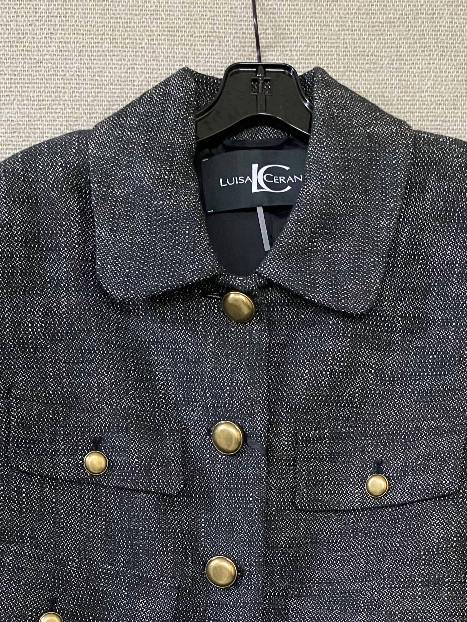 A blazer so versatile you can wear it to the office or pair it with jeans for a more casual look. Introducing the LUISA CERANO Tweed Blazer, a chic and structured piece in sophisticated grey. This long sleeve blazer is crafted from a cotton blend and features a boxy cut with a turn-down collar and shoulder pads. It measures 21.25 inches in length and boasts convenient flap pockets with button closures. For a polished look, the blazer has a button closure and button placket on sleeve cuffs, and it is finished with a smooth tweed fabric lining. Dry clean only.
