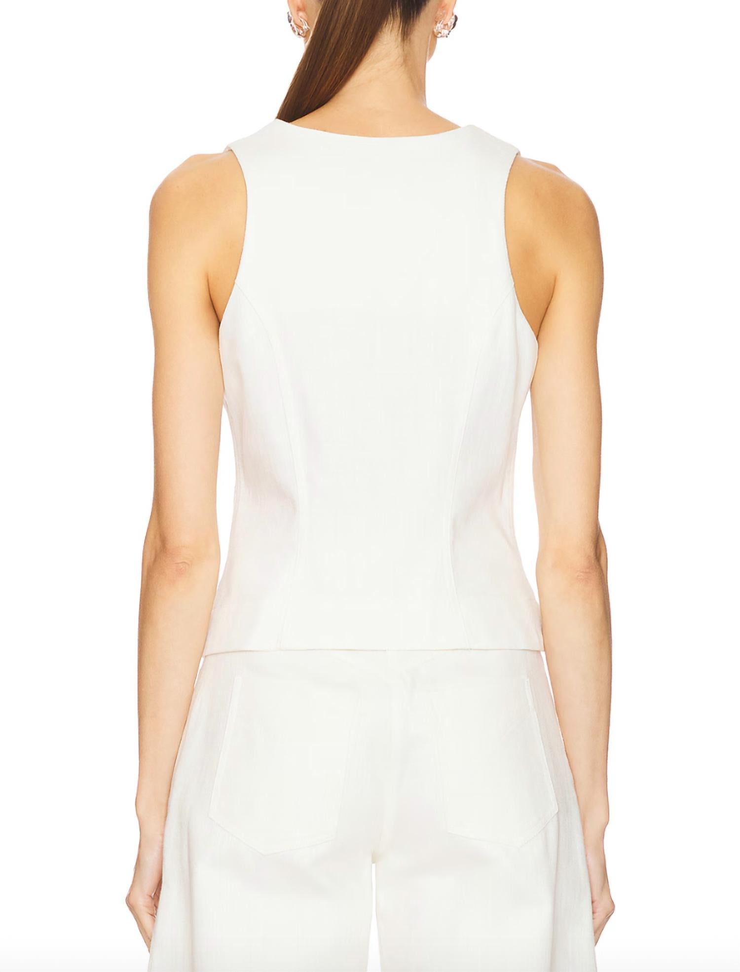 That extra layering piece you didn't know you needed! The Scoop Neck Vest by Matthew Bruch is an elegant addition to your summer wardrobe. This sleeveless vest is made from 100% cotton in a midweight rigid denim fabric, accentuating its tailored design and scoop neck. It features front button closures and a classic white denim color, making it perfect for travel and workwear occasions. Proudly made in the USA, this vest should be dry cleaned to maintain its crisp look.