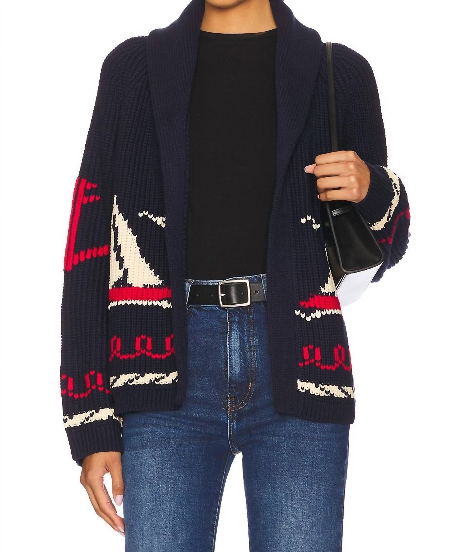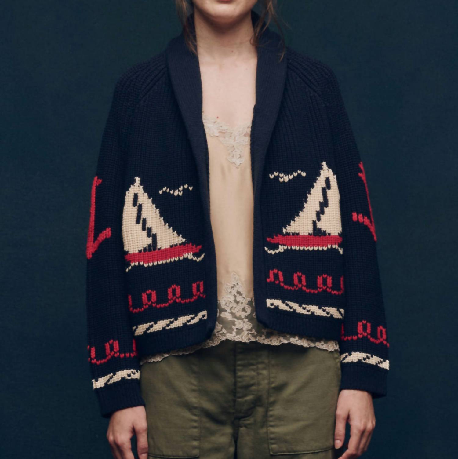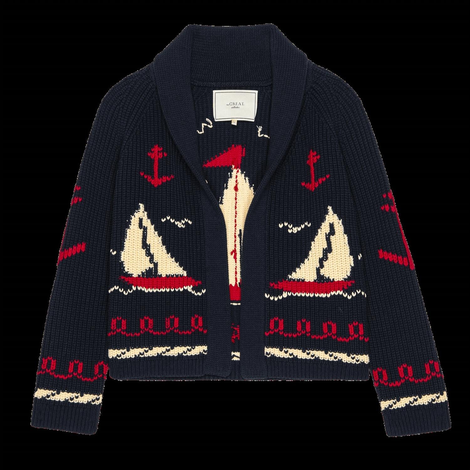 Introducing The Sailboat Lodge Cardigan by THE GREAT., a tribute to 1960s nautical charm in dark navy. This women's cardigan features long sleeves with hand-embroidered graphic boats and sailor motifs, adding a touch of maritime nostalgia. Made from a 60% cotton and 40% acrylic blend, it offers both comfort and style for fall occasions. Easy to wear and maintain, it comes with a pull-on closure and is machine washable with a tumble dry.