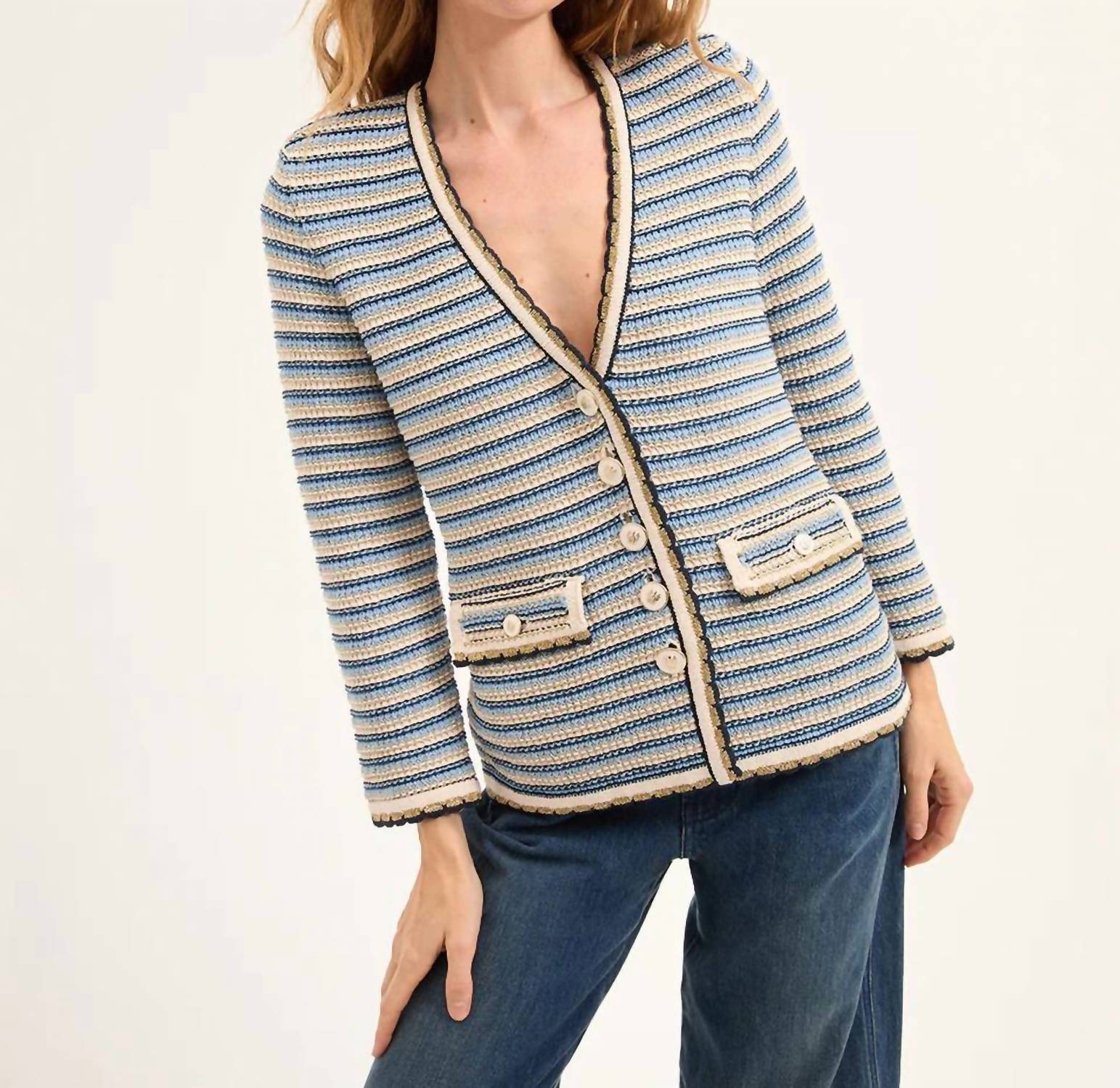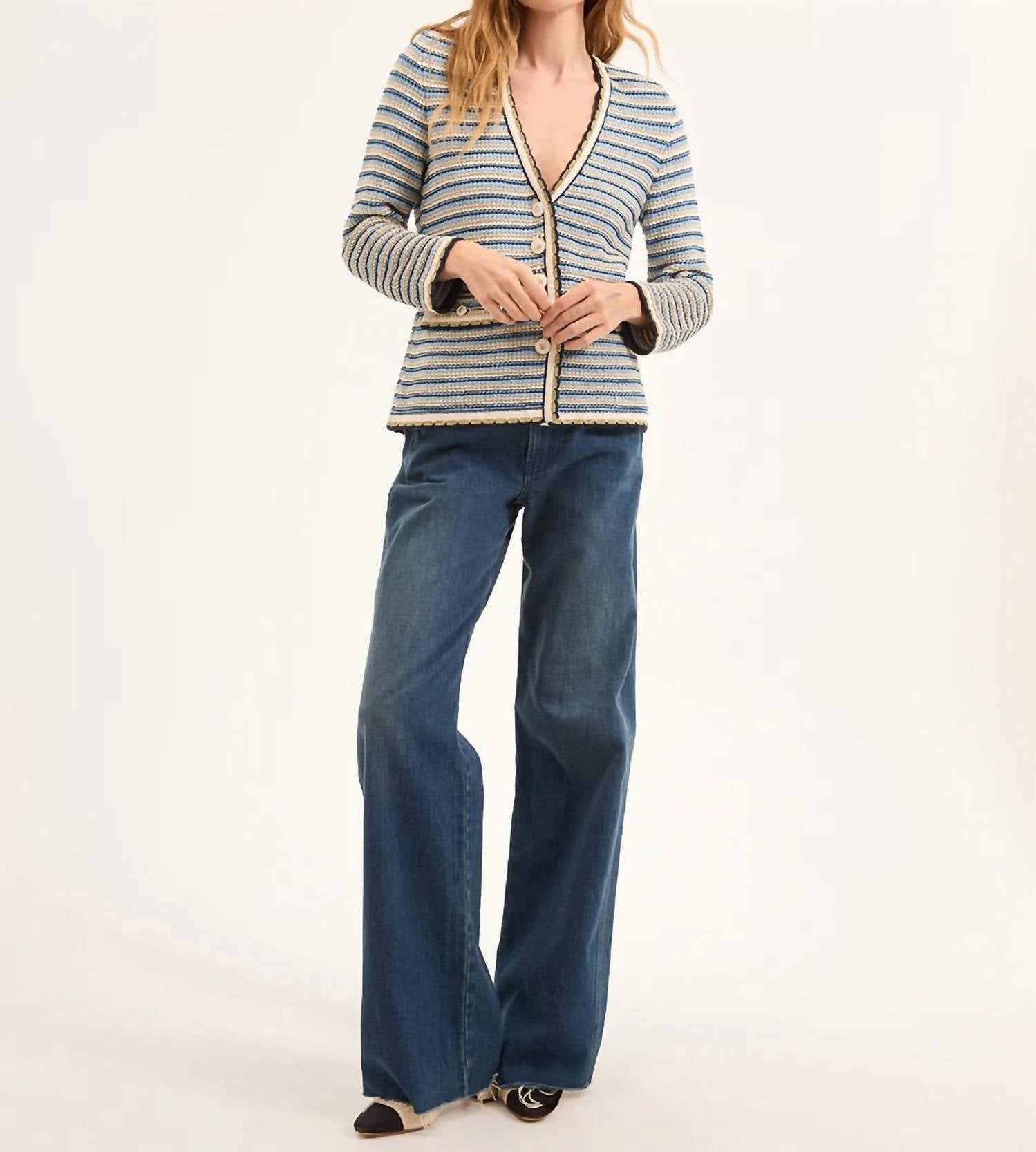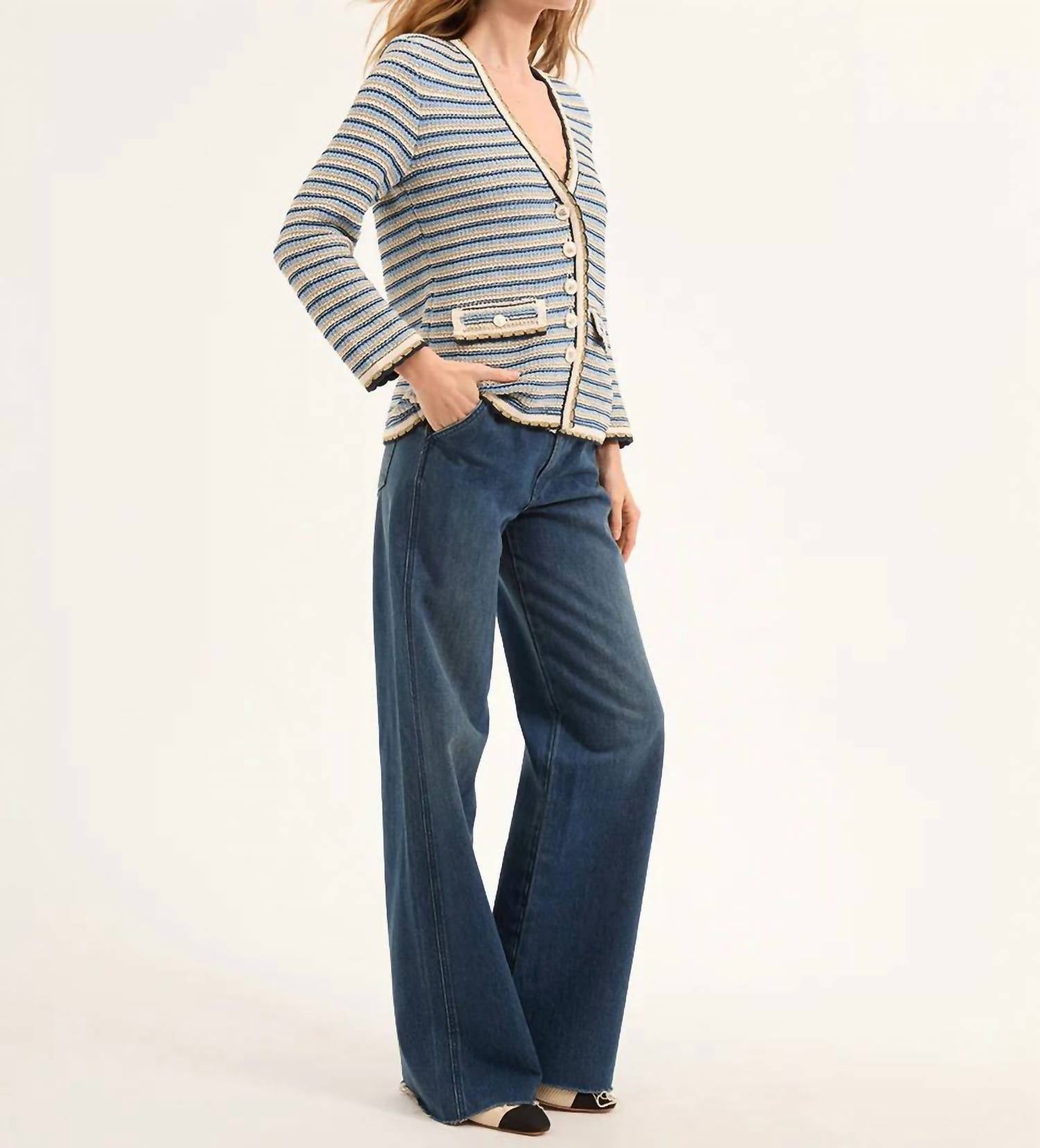 This cardigan will be a sweater-rotation favorite. Discover the Ceriani Knit Jacket by Veronica Beard, offering the ease of a cardigan with the polish of a jacket. This Italian marvel is crafted from a cotton blend, featuring long sleeves, a deep-V neckline, and an elongated silhouette with navy multi stripes. Designed with flap pockets and enamel crest buttons, it ensures style and functionality. Composition: 78% Cotton, 22% Polyamide. Closure: Button closure. Care: Dry clean only.