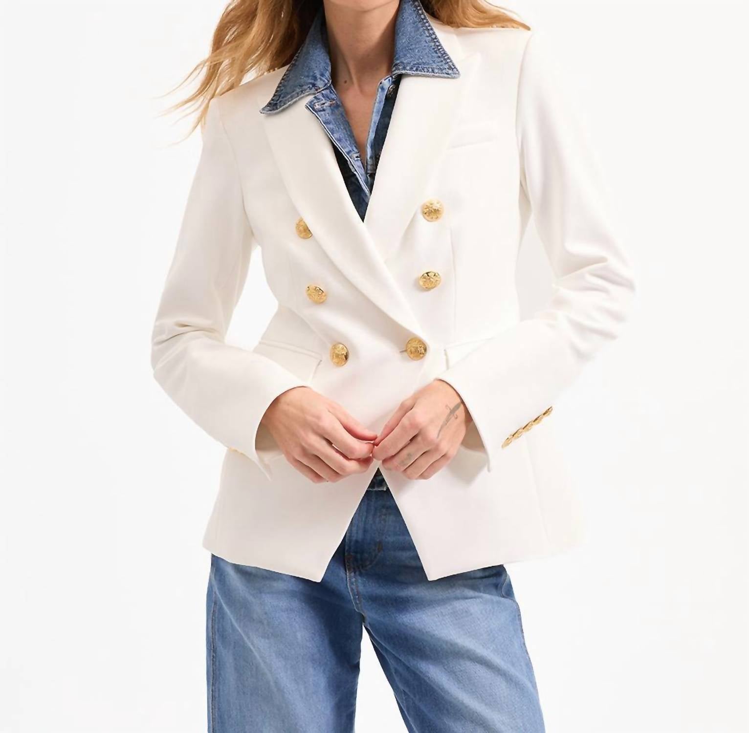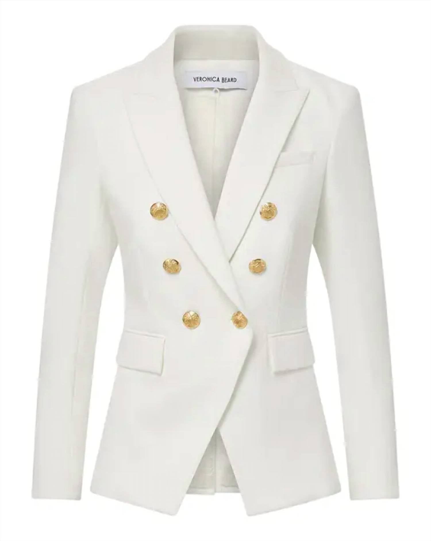 An elevated version of your favorite classic blazer. Introducing the Veronica Beard Miller Dickey Jacket in Off-white Gold, a timeless staple for sophisticated occasions. This blazer features long sleeves and is composed of 63% Polyester, 27% Viscose, 7% Cotton, and 3% Elastane, offering a slight stretch for comfort and flexibility. With a garment length of 32.75 inches, the jacket has a polished, tailored fit complemented by decorative crest buttons for its button closure. Please note, this versatile piece is to be professionally dry cleaned only. Style #CORESU0021492G.