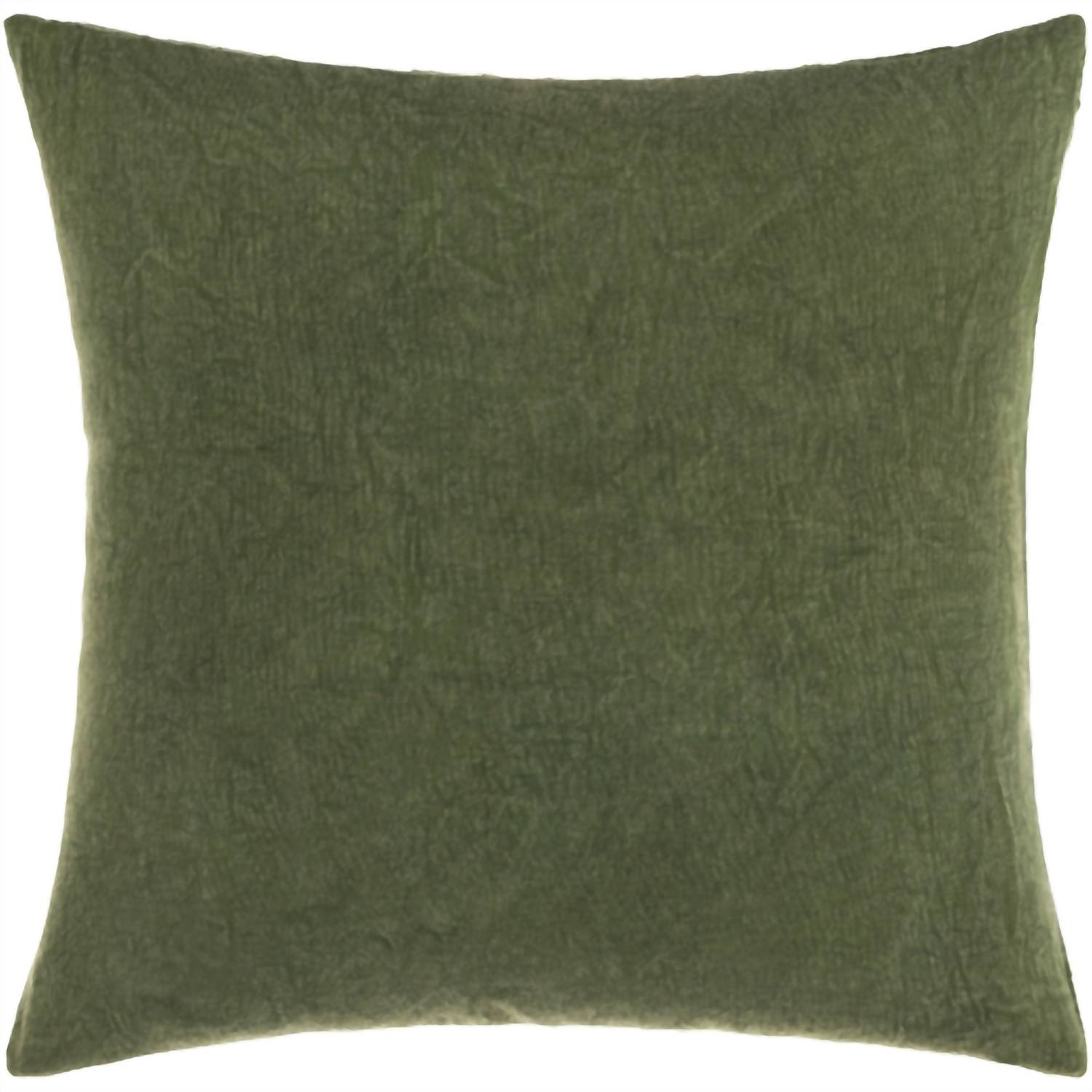 Forest green throw pillow with a subtle geometric pattern on the front side. 100% Cotton. Dimensions 18 X 18. Made in India.