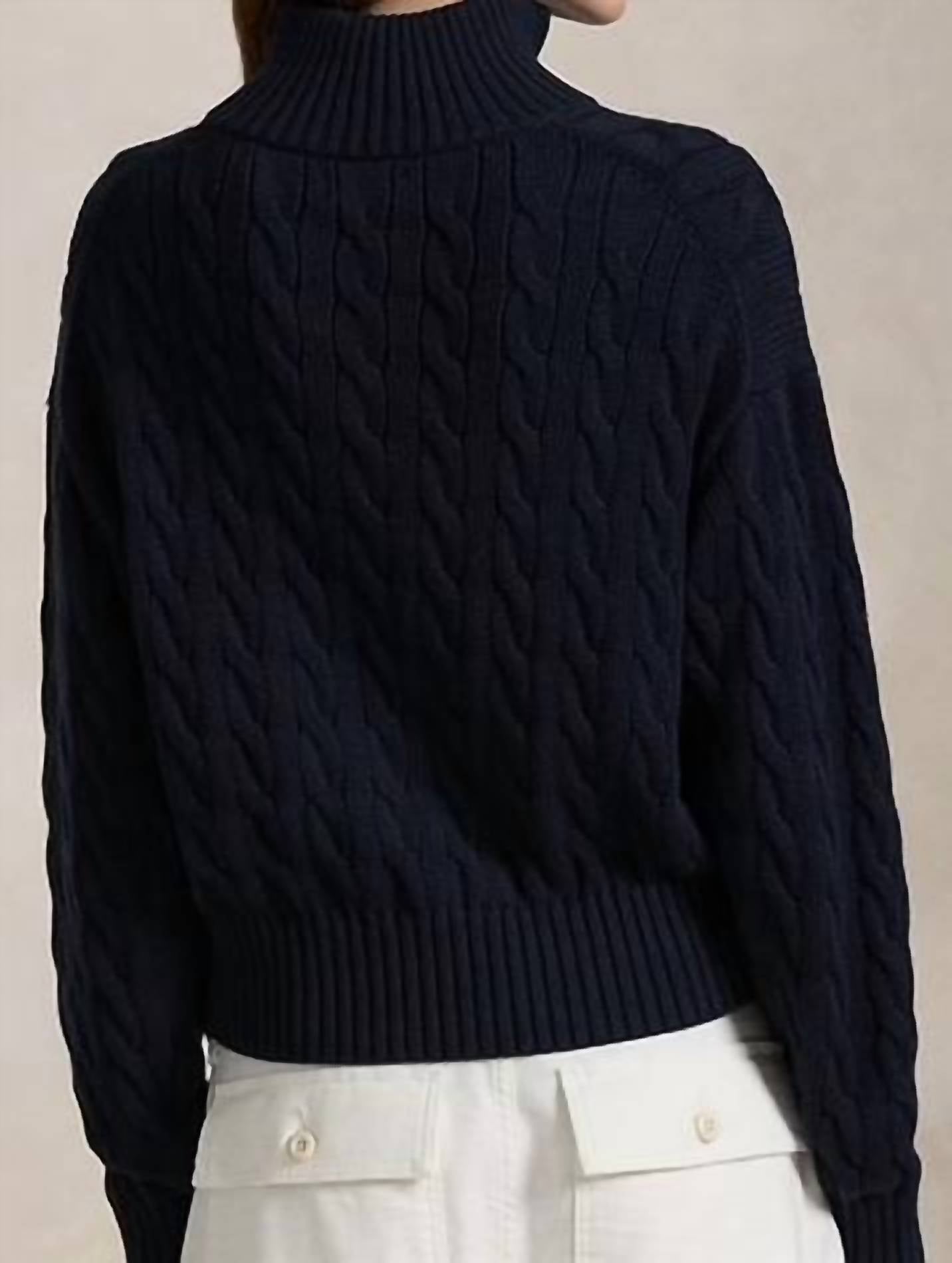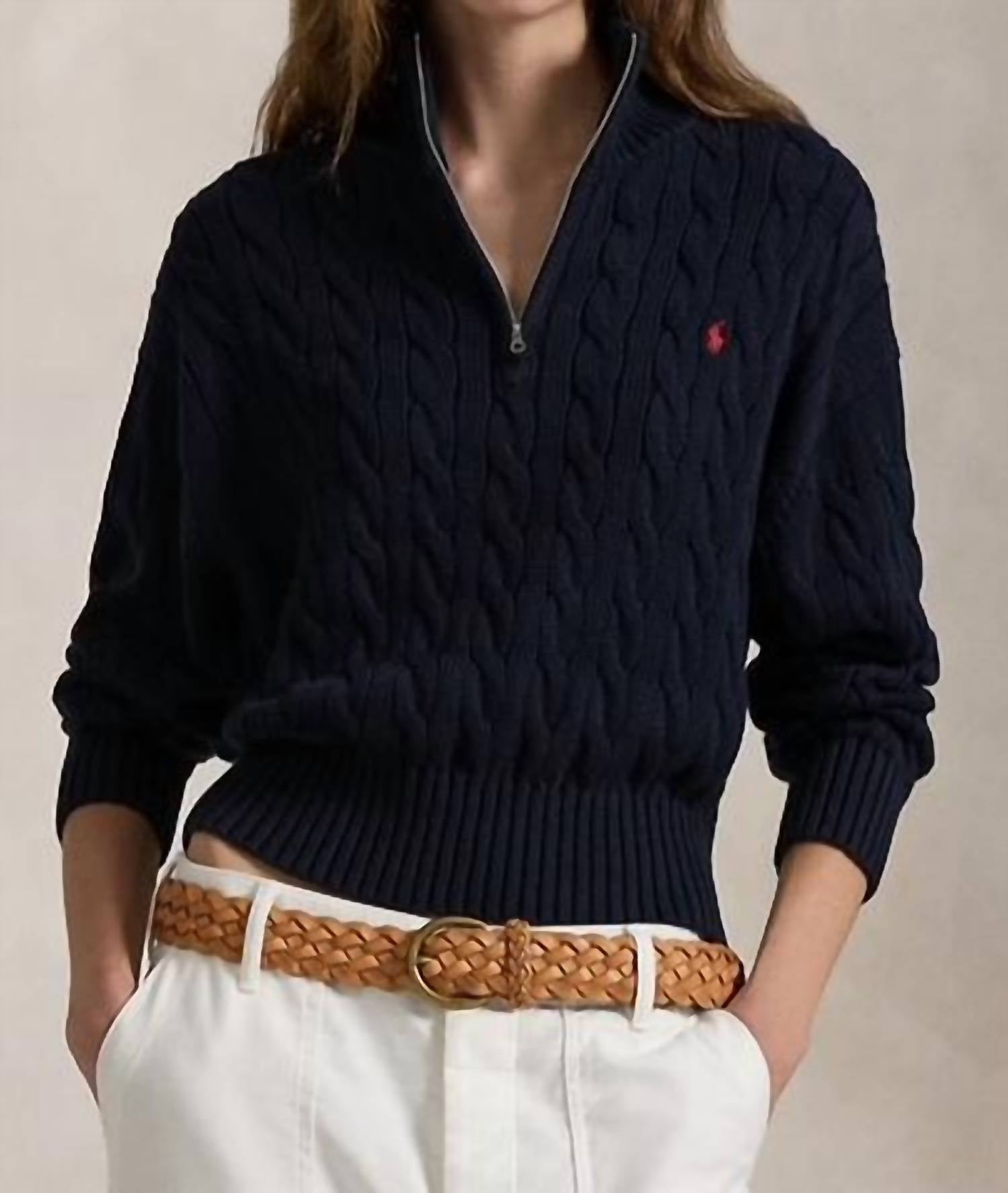 Layer under your favorite sweater or wear tucked into jeans for a perfectly polished winter look. Combining the casual styling of a pullover with our iconic cable-knit construction, this quarter-zip sweater is crafted from chunky cotton yarn and meticulously embroidered with our signature Pony on the chest. Relaxed fit. Designed to hit at the hip. Size M has a 54 cm body length and a 51 cm sleeve length. Body length is taken from the high point of the shoulder. Rib-knit flap collar. Quarter-zip placket. Long sleeves with rib-knit cuffs. Rib-knit hem. Signature embroidered Pony on the left chest. 100% cotton. Machine washable or dry clean. Imported.
