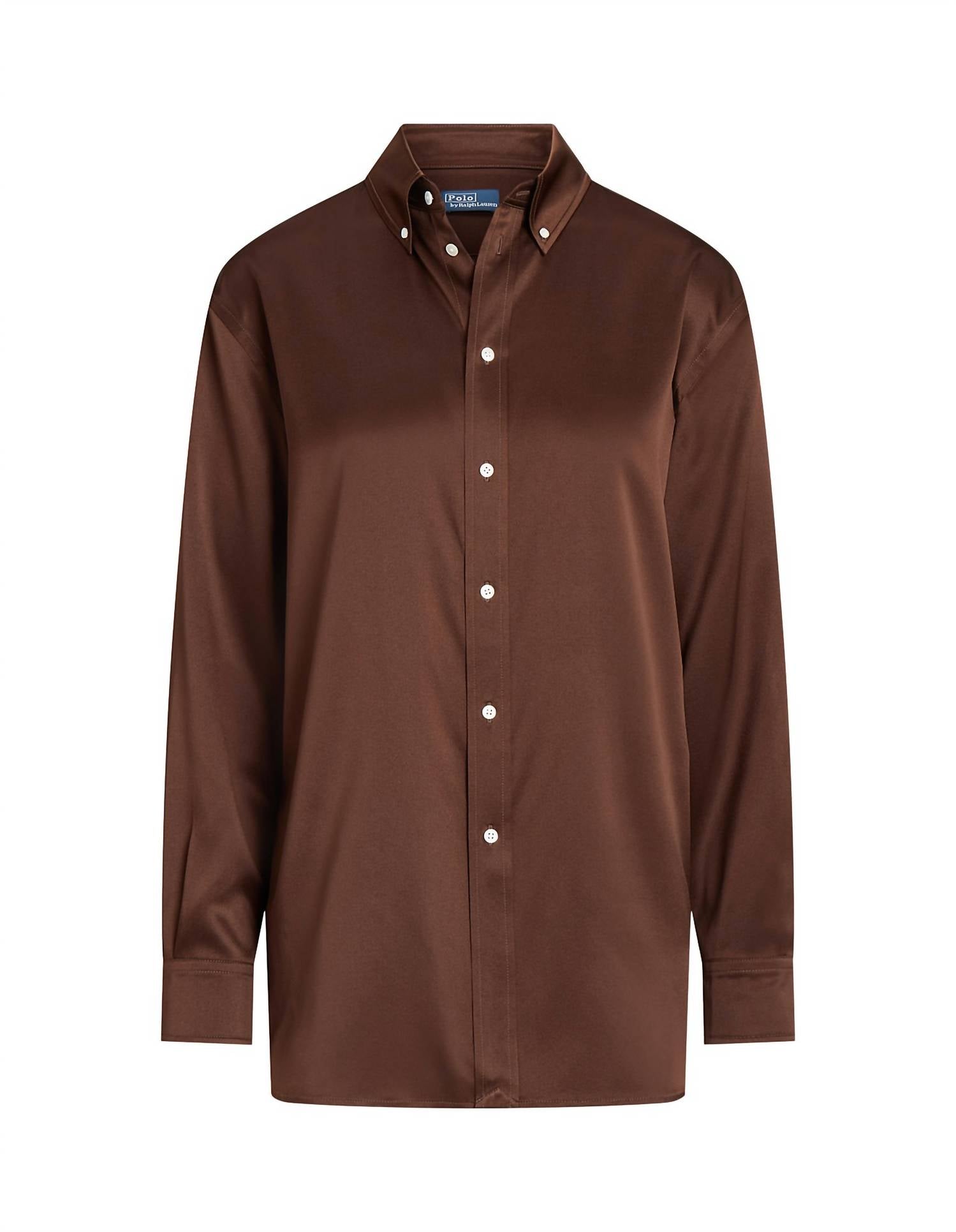A timeless blouse that will never go out of style. Discover the Polo Ralph Lauren Relaxed Fit Silk Charmeuse Blouse in elegant Dark Brown, crafted from 100% mulberry silk for an ultra-luxurious feel. This long-sleeve blouse features a button closure with exquisite shell buttons and is designed to hit at the hip with a cozy relaxed fit. With dimensions of a 32" body length and 33" sleeve length, its refined details include a button-down point collar and a box-pleated back yoke. Care for this timeless piece by dry cleaning only.