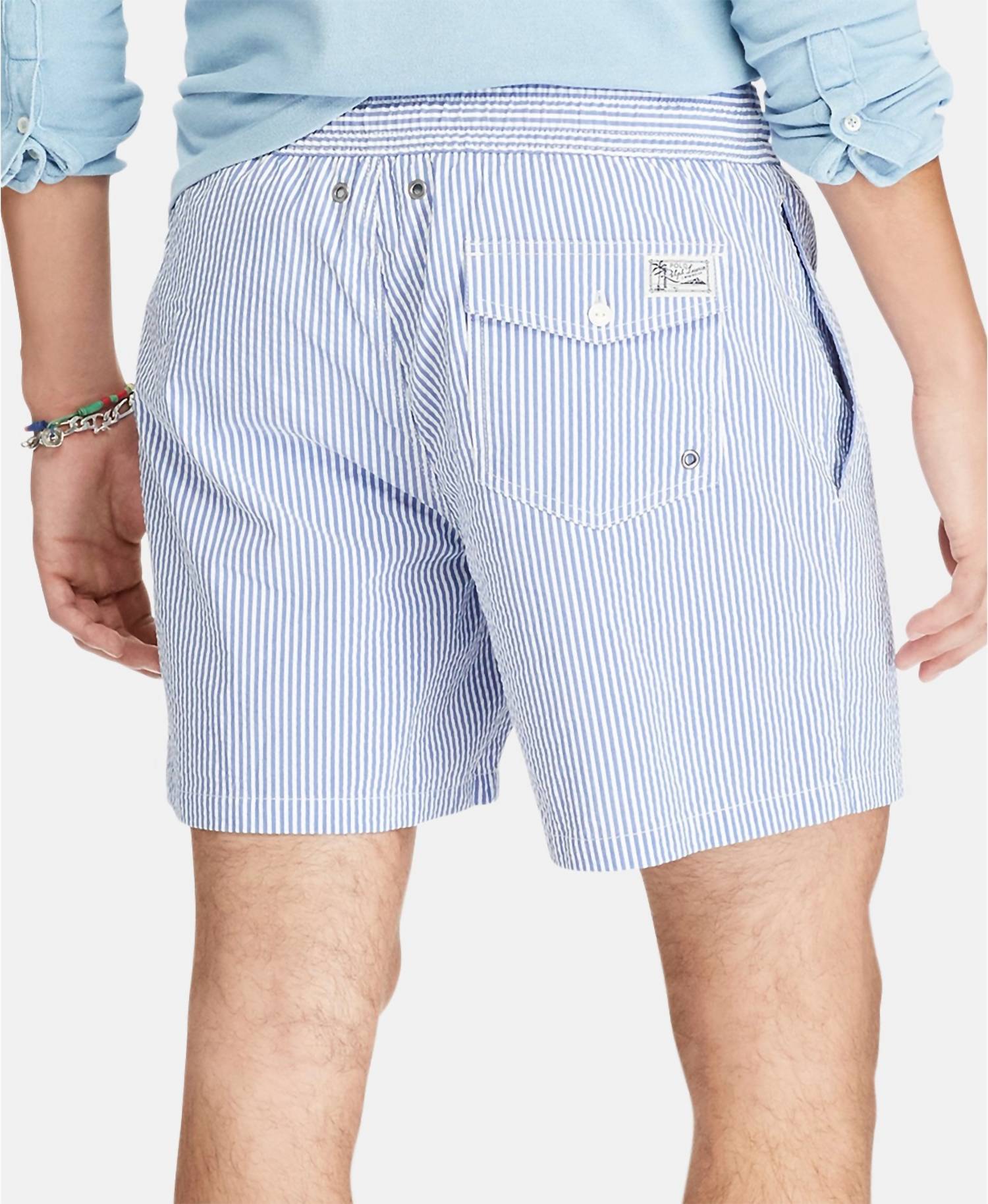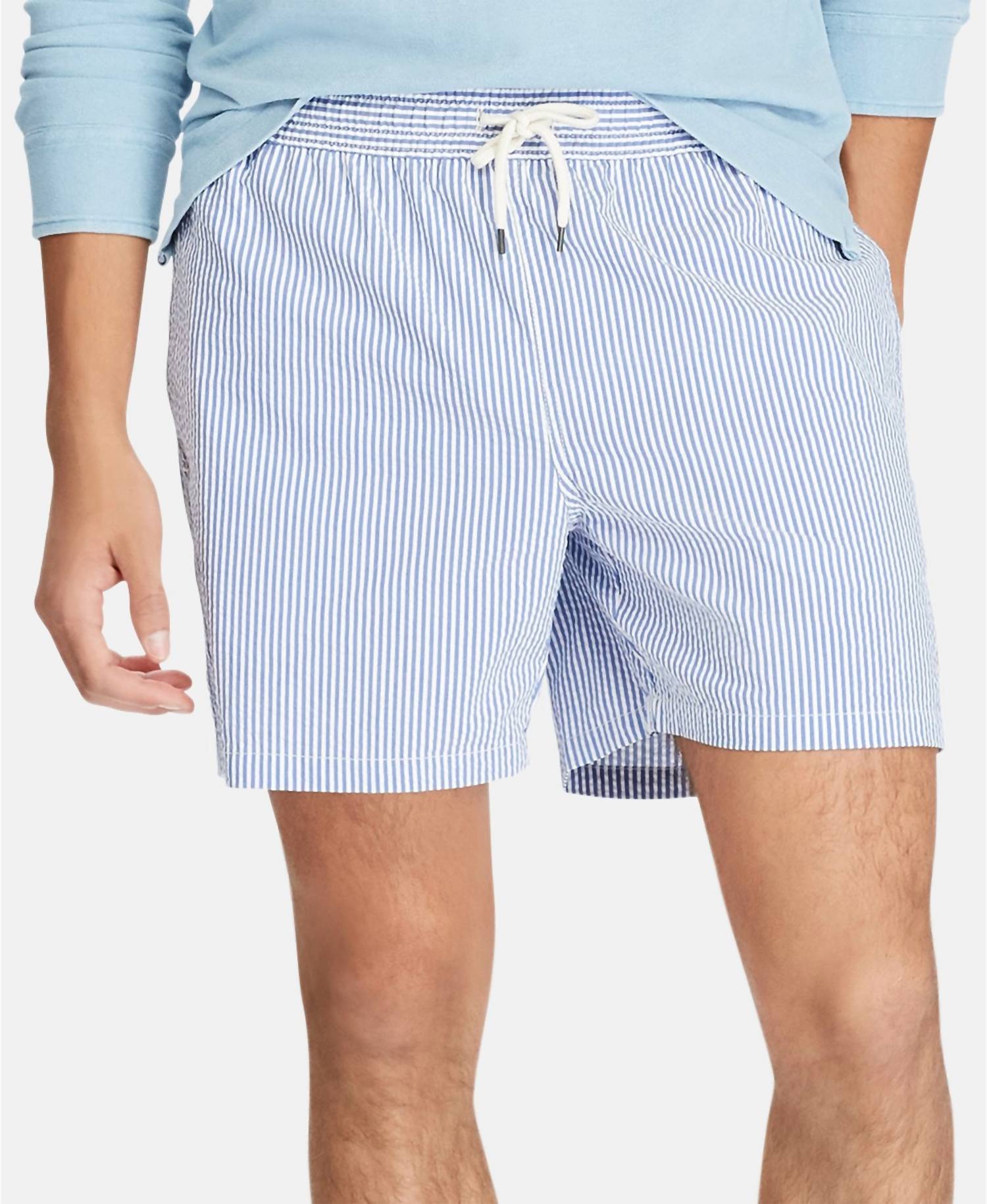 Dive into comfort and style with the Seersucker Traveler Swim Shorts by Polo Ralph Lauren. Perfect for any spring athleisure look, these Cruise Royal striped shorts are designed for both fitness and casual beach outings. Featuring practical pockets and a convenient tie closure, they're as functional as they are fashionable. Ideal for those looking to blend sporty appeal with a classic stripe pattern.