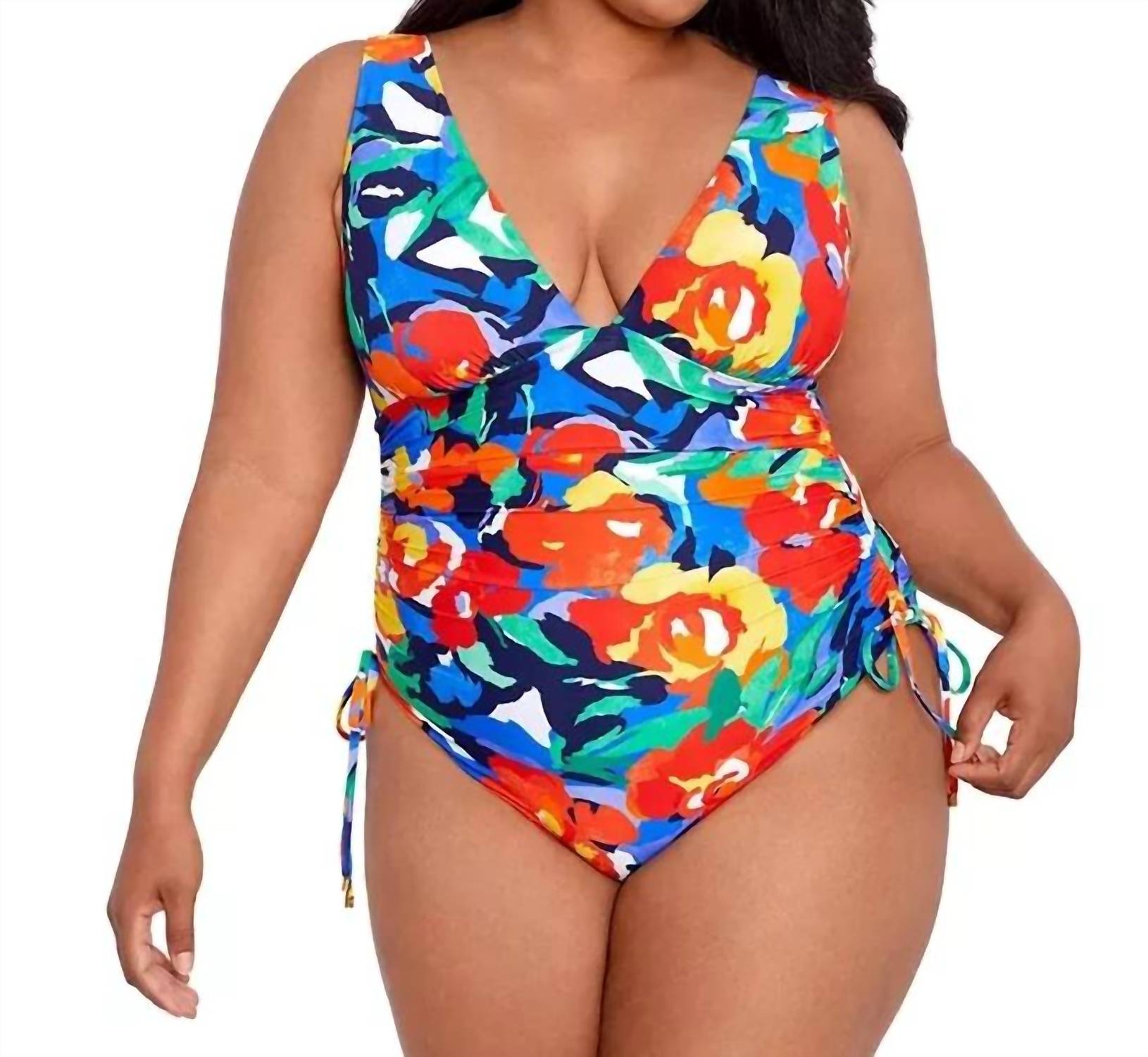 This one piece fits like a glove and covers all the right areas. Dive into summer style with the Plus Size Side-shirred One Piece Swimsuit by RALPH LAUREN, featuring a bold multi-color pattern for a Boho Chic beach day look. Designed with a plunging V-neckline and full coverage, it includes removable cups and non-adjustable straps for easy pull-on styling. This swimsuit comprises a nylon/elastane blend with polyester lining and contrast. Care instructions: Hand wash and line dry.