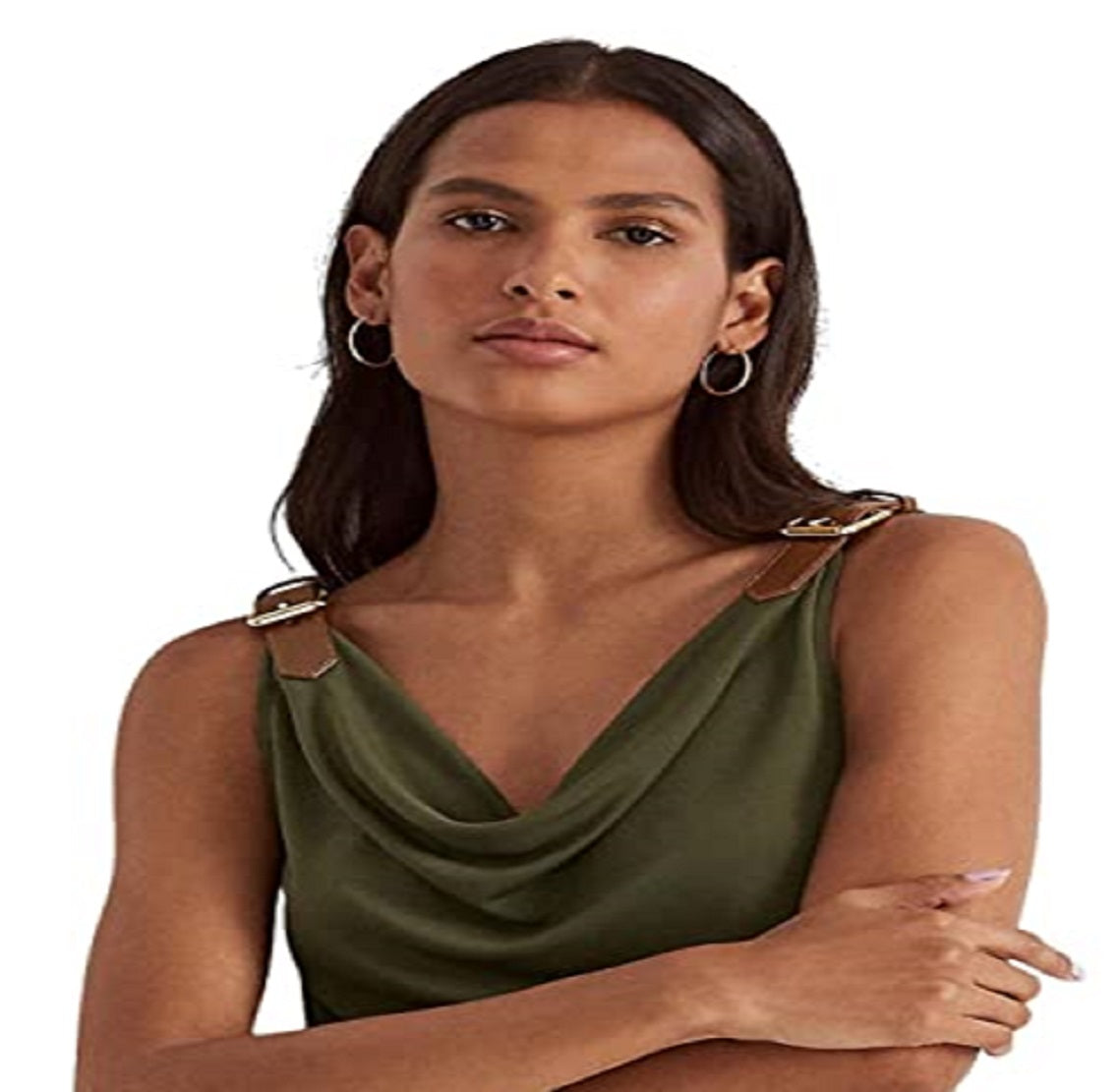 Look chic and sophisticated in Ralph Lauren Jersey Cowl Neck Tank Top| Slim fit| Cowl neckline| Sleeveless with faux leather-buckle straps| Straight hemline is intended to hit at the hip| Pull-over style| 94% polyester