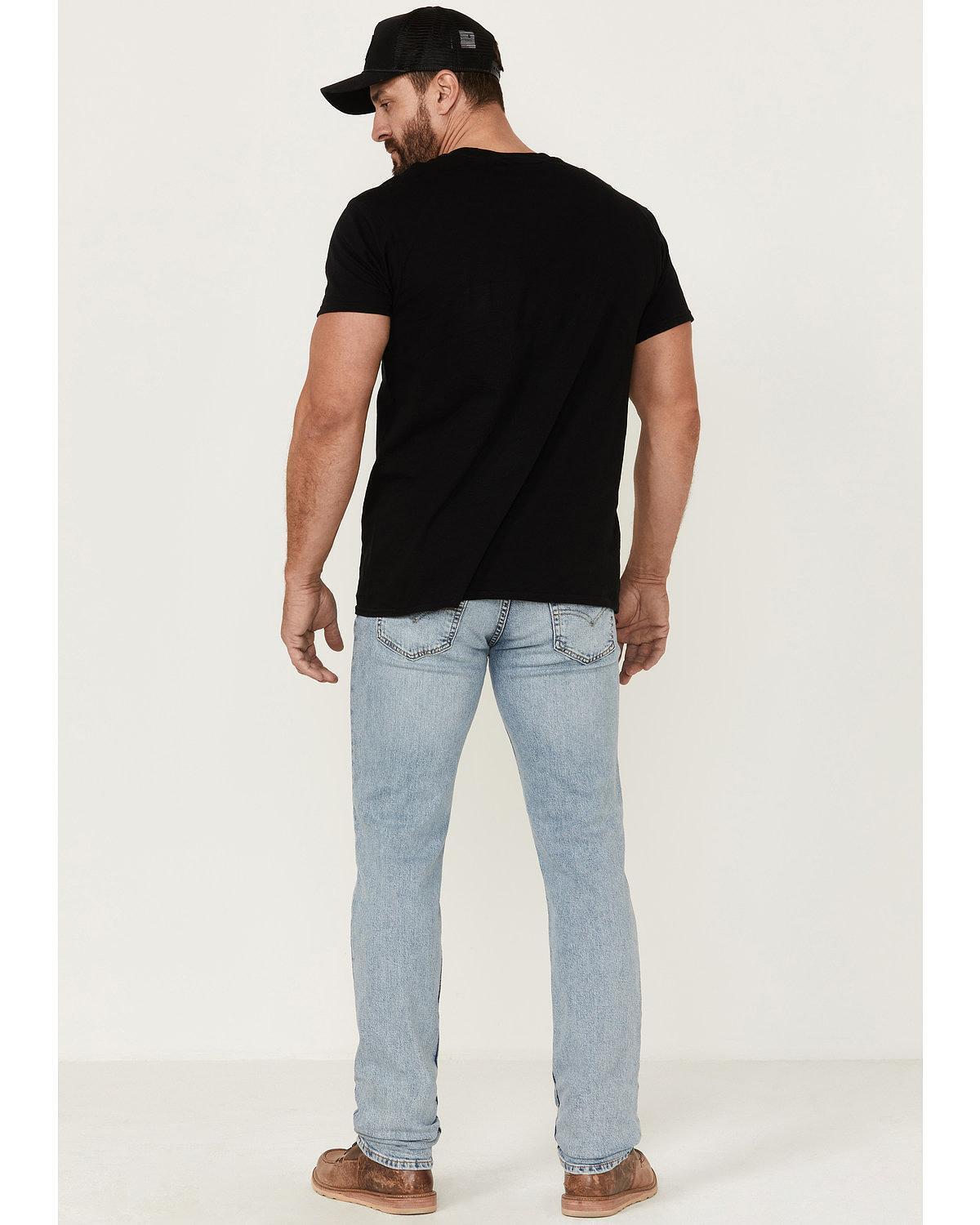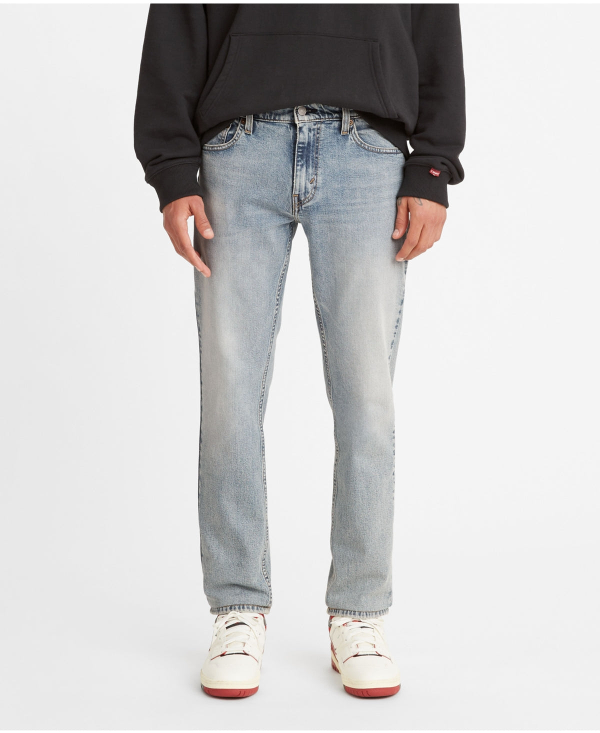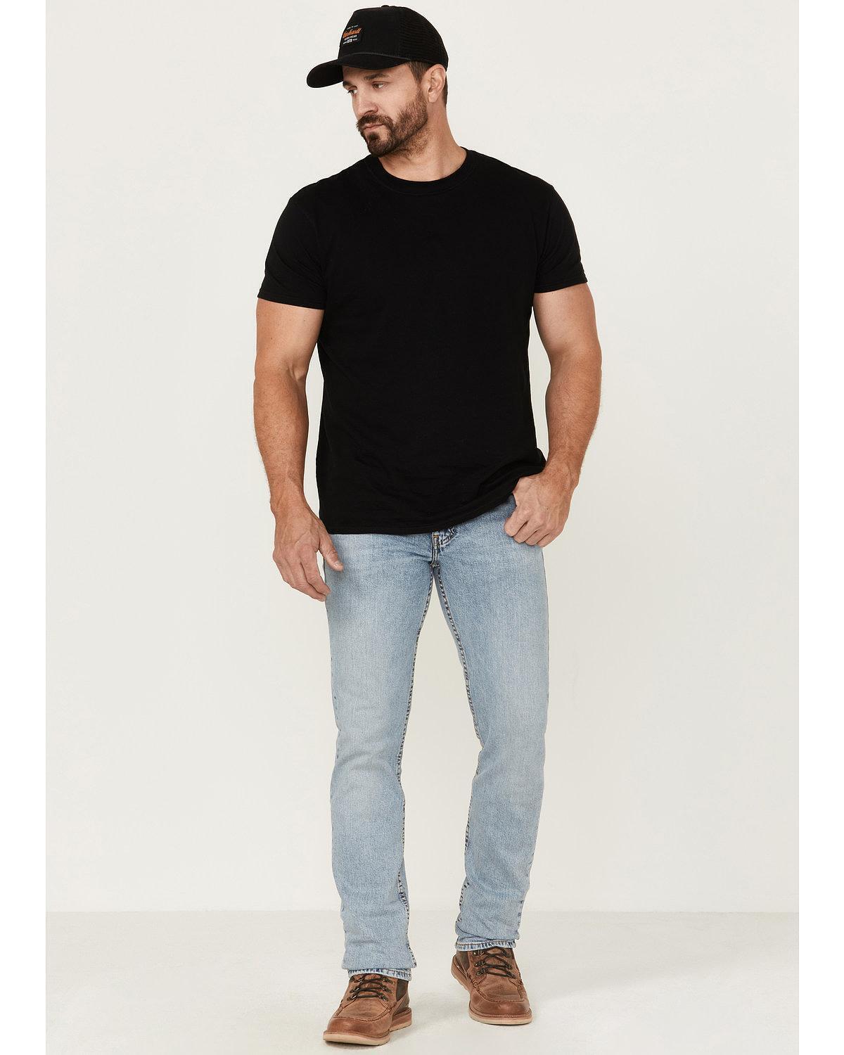 . 98% Cotton / 2% Elastane. Zip-fly with button closure. 5 Pocket design. Everyday Authentic light wash. Straight leg. Slim fit. Sits at waistClassic stitch detailing on back pocketsHand sanding details with whiskering on front legs.|center {|position; absolute;|bottom; -512px;|right; 290px|}|98% Cotton / 2% Elastane