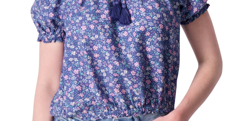 Breeze through the season in this short-sleeve peasant top from Lucky Brand| a pretty floral pick fashioned with tassels at the neckline.| Relaxed fit| Split neckline with tassel ties| Ruffled edges at sleeves and hem| Cotton/viscose