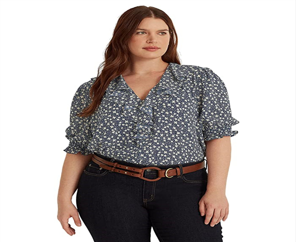 Look chic wearing the classy and feminine Ralph Lauren Floral Crepe Blouse| perfect to wear while going to the office| Relaxed fit| Pullover style| V-neckline with ruffle trim and elbow-length sleeves with smocked cuffs| Allover eye-catching floral print| Shirttail hemline