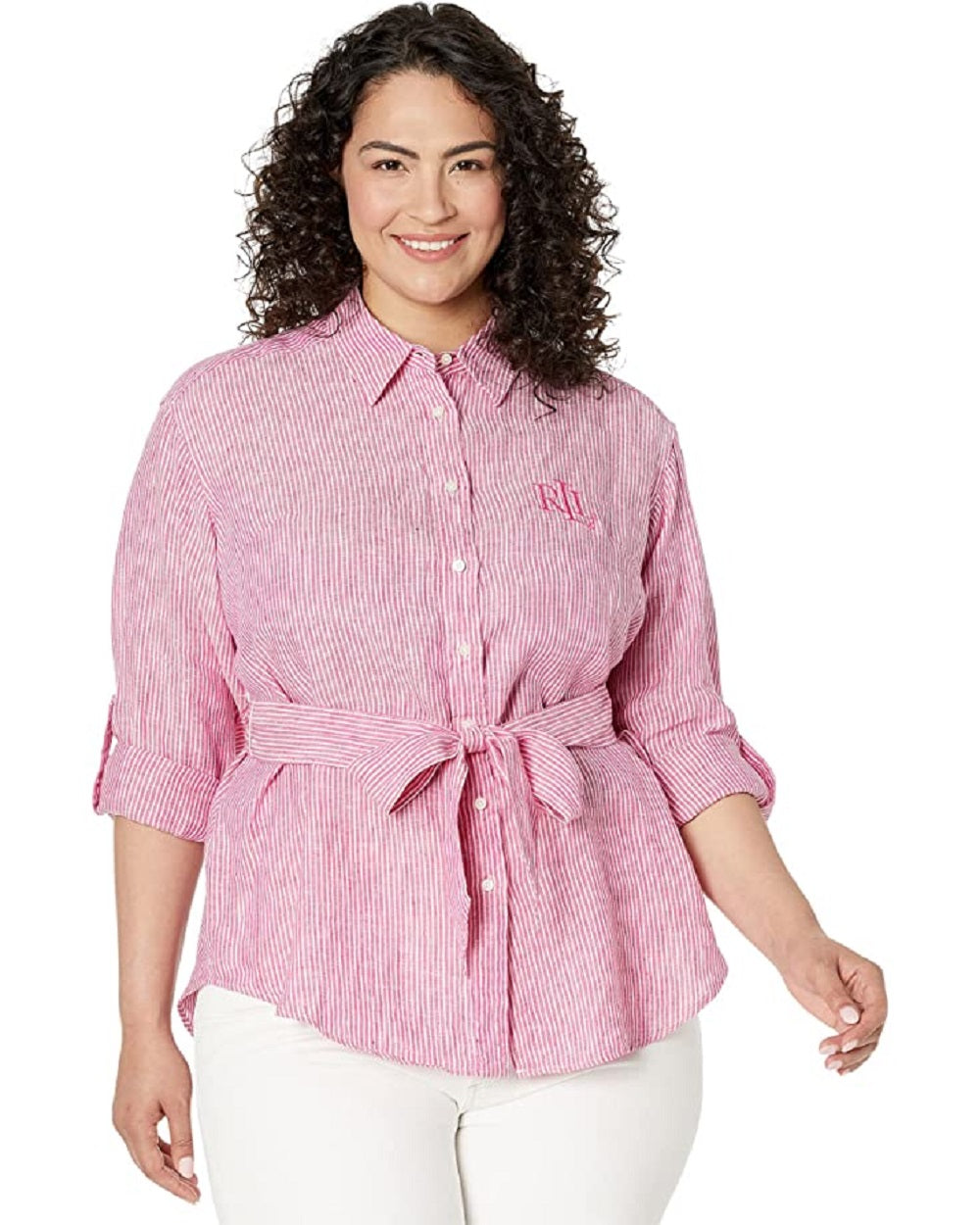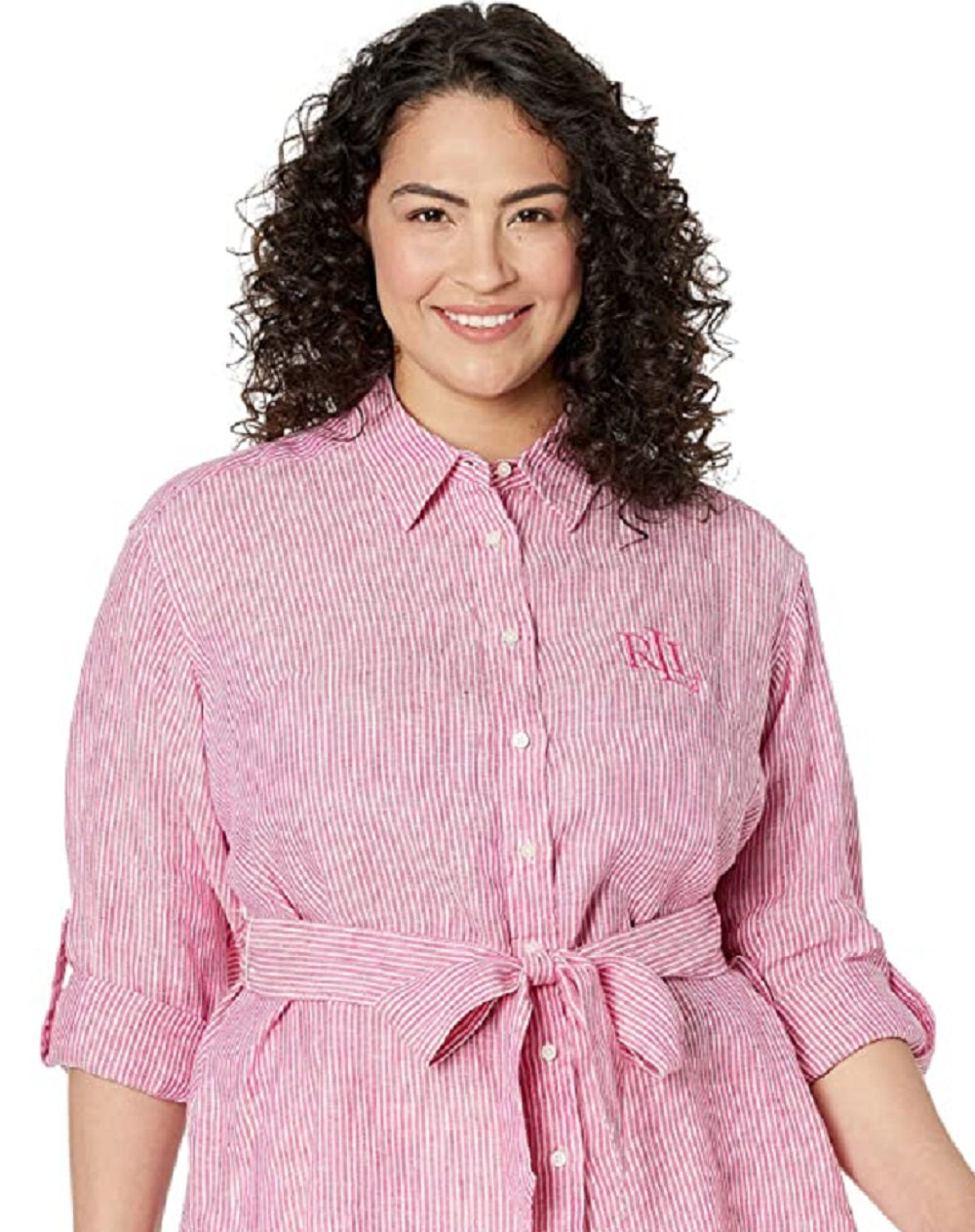Feel free to enjoy your casual fun moments| wearing Ralph Lauren Plus Size Striped Logo Linen Shirt| Straight fit| Point collar| Buttoned placket with signature engraved buttons| Long roll-tab sleeves with buttoned barrel cuffs| Back yoke