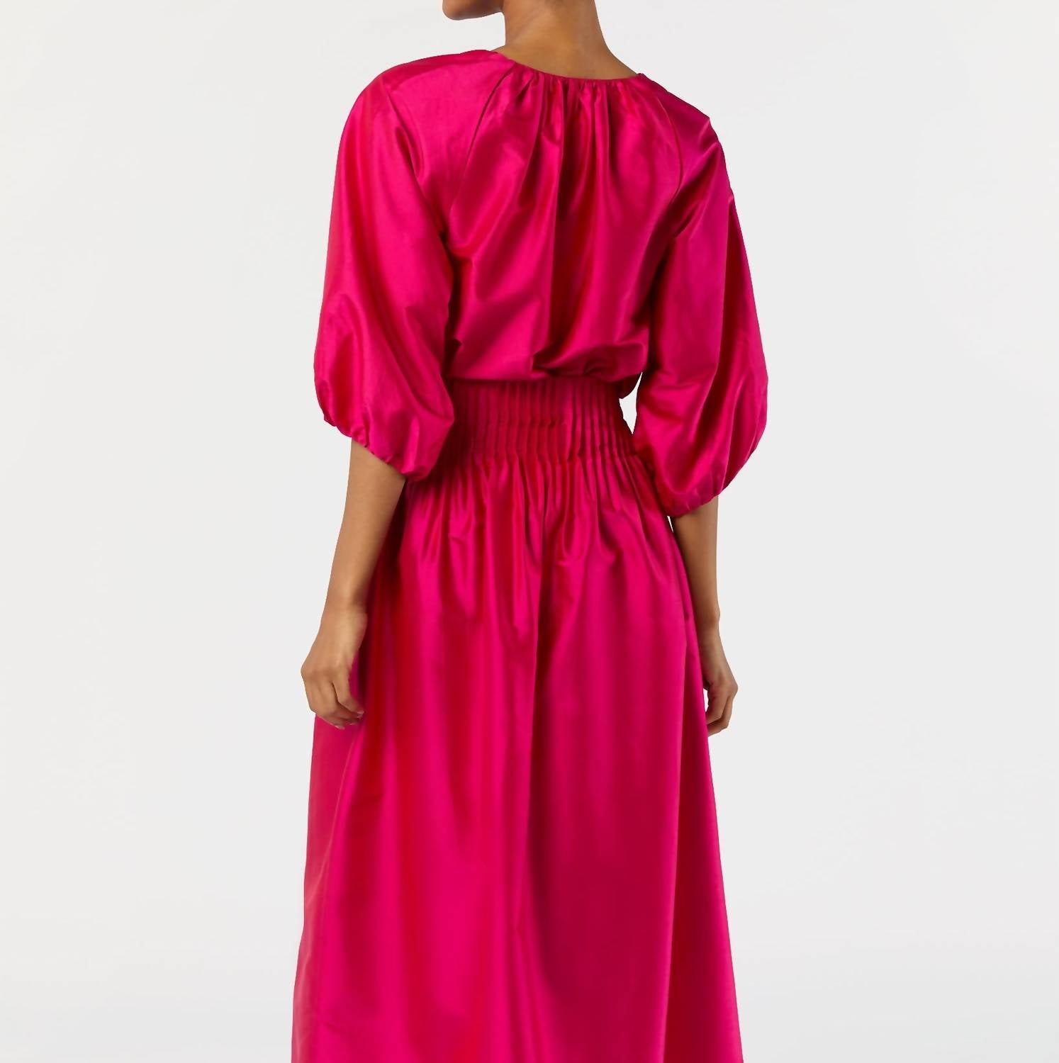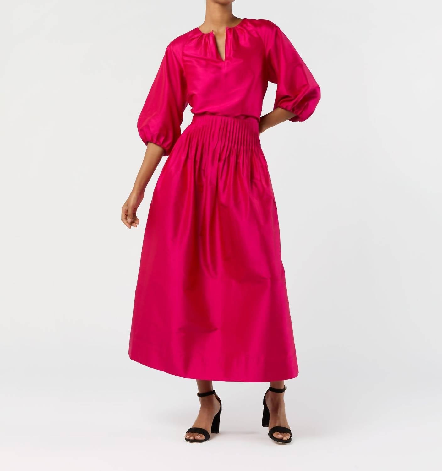 A timeless blouse that will never go out of style. Elevate your wardrobe with the Savannah Top by Ann Mashburn, a luxurious statement piece in vibrant fuchsia. With its gathered, three-quarter length sleeves, this blouse is crafted from washed Indian silk shantung and tailored with French seams. The design includes a pleated neckline, grosgrain facing at sleeve openings, and a keyhole closure at the center back, finishing with a chic round hem with side slits. Made in India with 100% silk, it requires dry cleaning to maintain its opulent texture and appearance. Model wears a size S and is 5’10” tall.